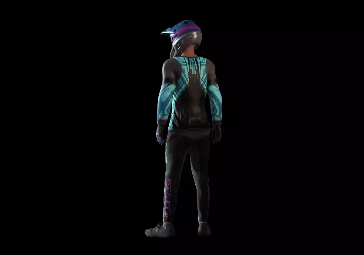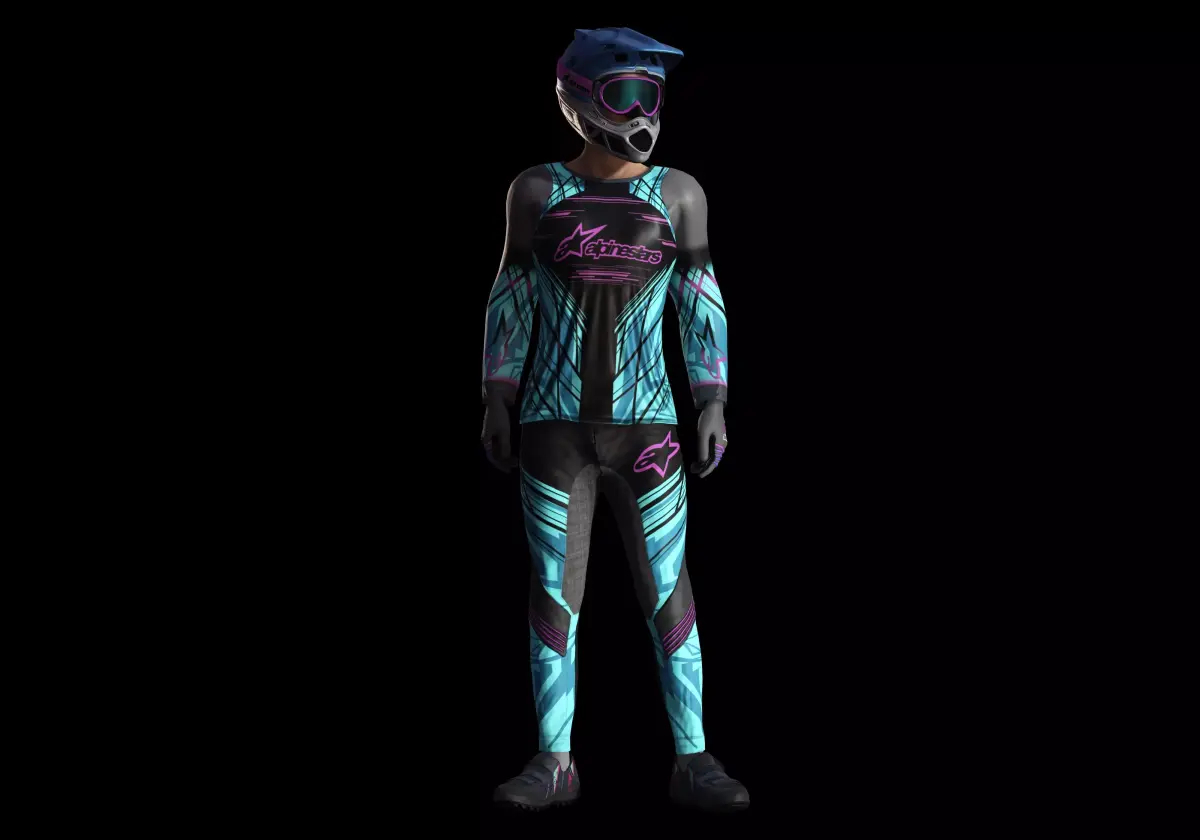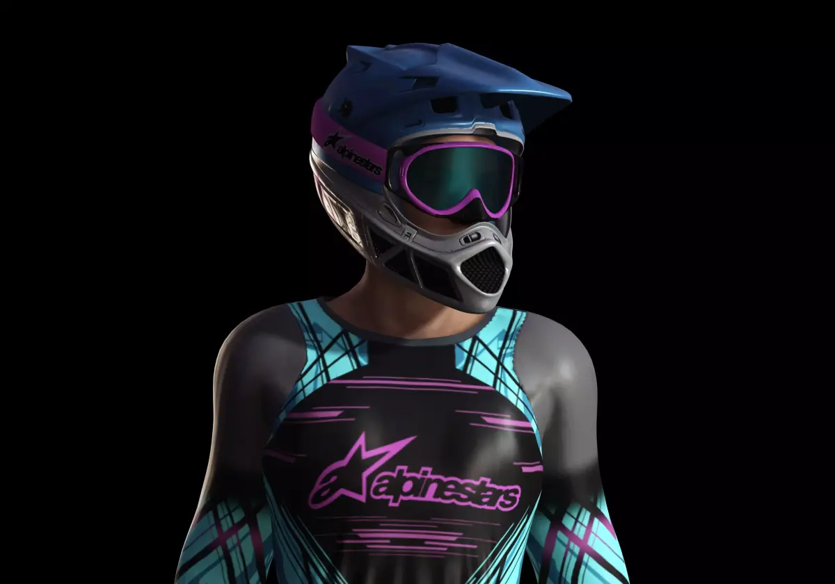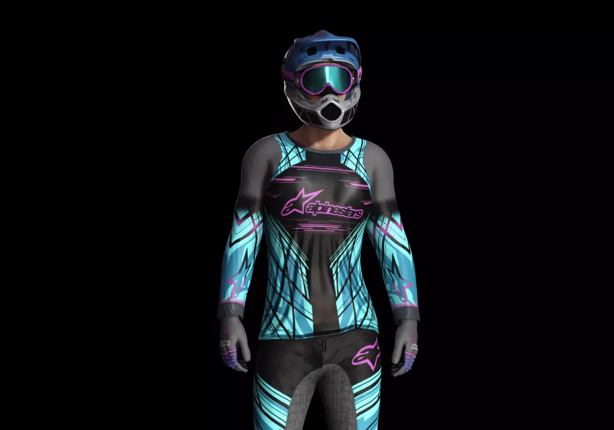 High-quality 3D model of a downhill mountain bike rider wearing detailed Alpinestars gear. The model includes a full-face helmet, goggles, gloves, jersey, and pants with realistic materials and vibrant textures. Perfect for sports visualizations, biking games, and promotional renders.