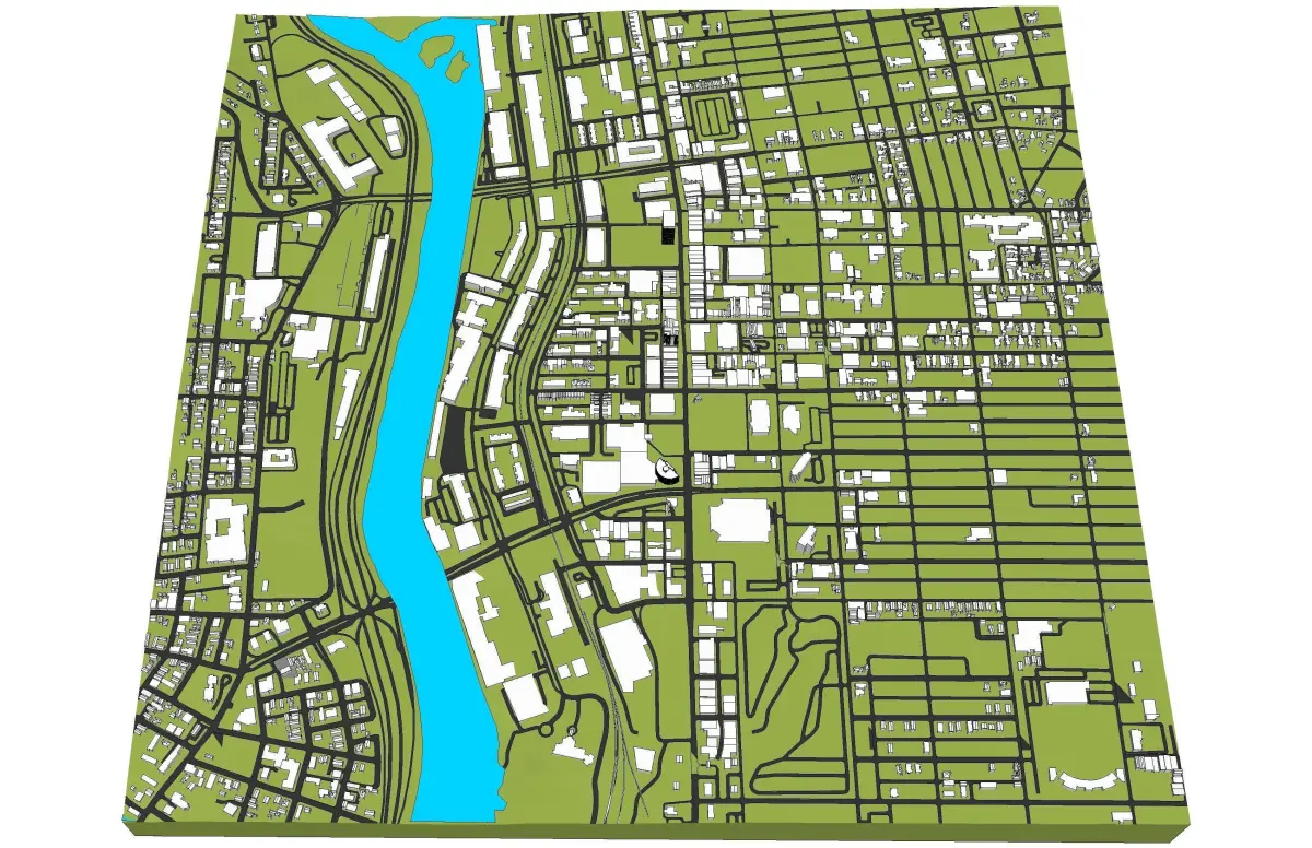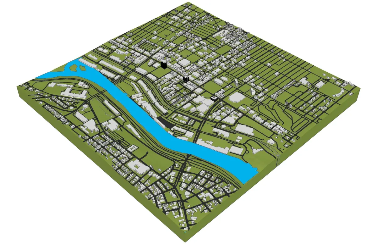 This model consist of one image file/tile with the buildings, roads, paths, water drapped onto the surface. The model was created and intended as a massing model only.