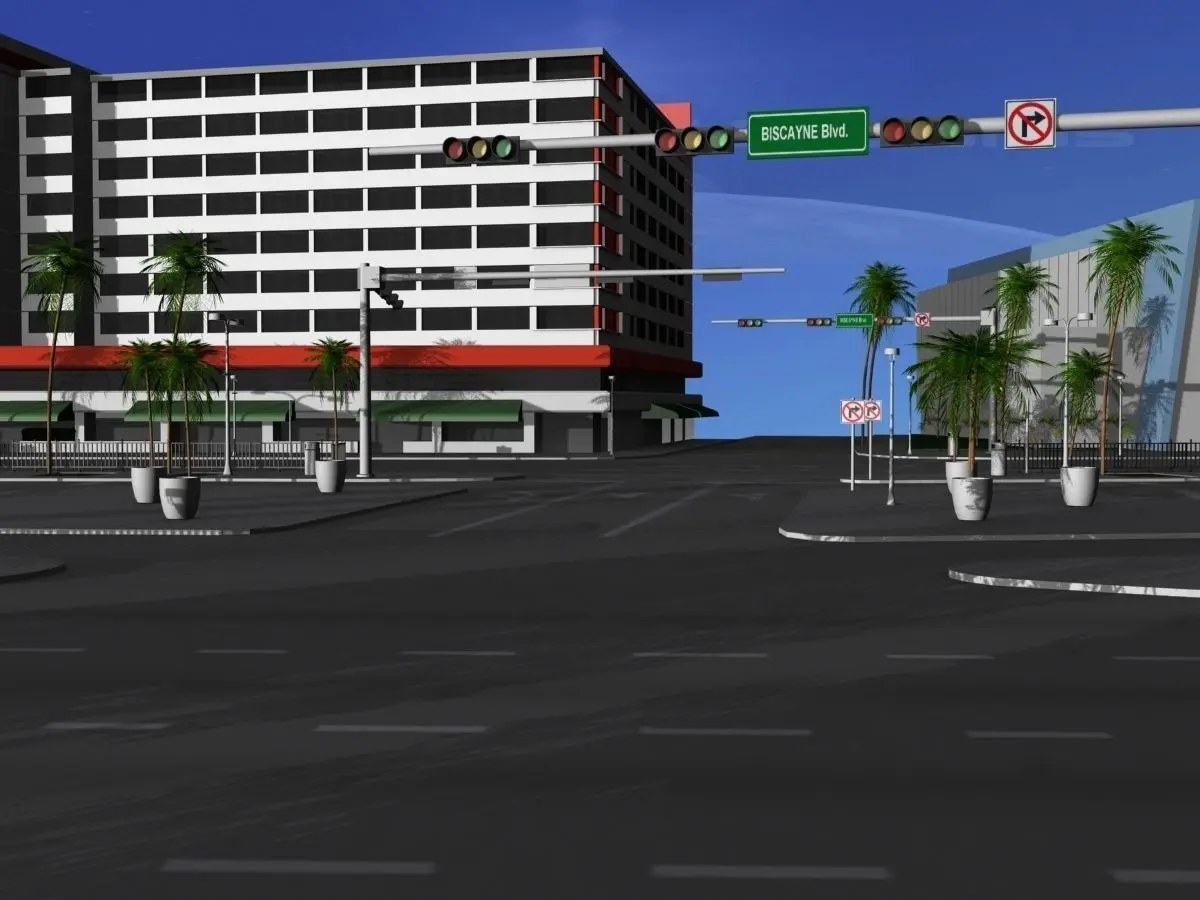This model was built to reflect current conditions at that intersection and give a realistic environment for architectural projects at that location. The model includes a near scale representation of the streets, Biscayne Blvd. and NE 4rth Street., the area on the east side and west side of Biscayne Blvd, with a park, a restaurant, a parking garage, sidewalks, trees and bushes, signage. Street lights, traffic signals, trash receptacles, aluminum fences, center of the Blvd Parking areas, and accurate building fronts are shown in as much detail as was available. No trademarks or corporate signage is included. The model has several buildings, streets, sidewalks, ground, and many other structures and objects fully textured.
