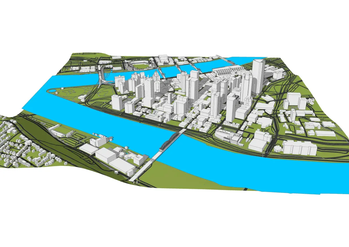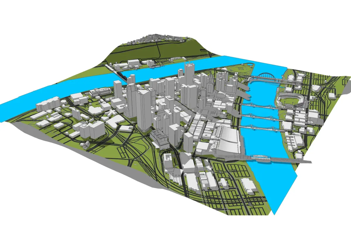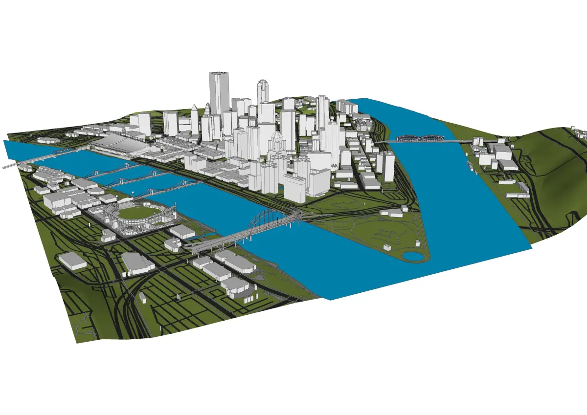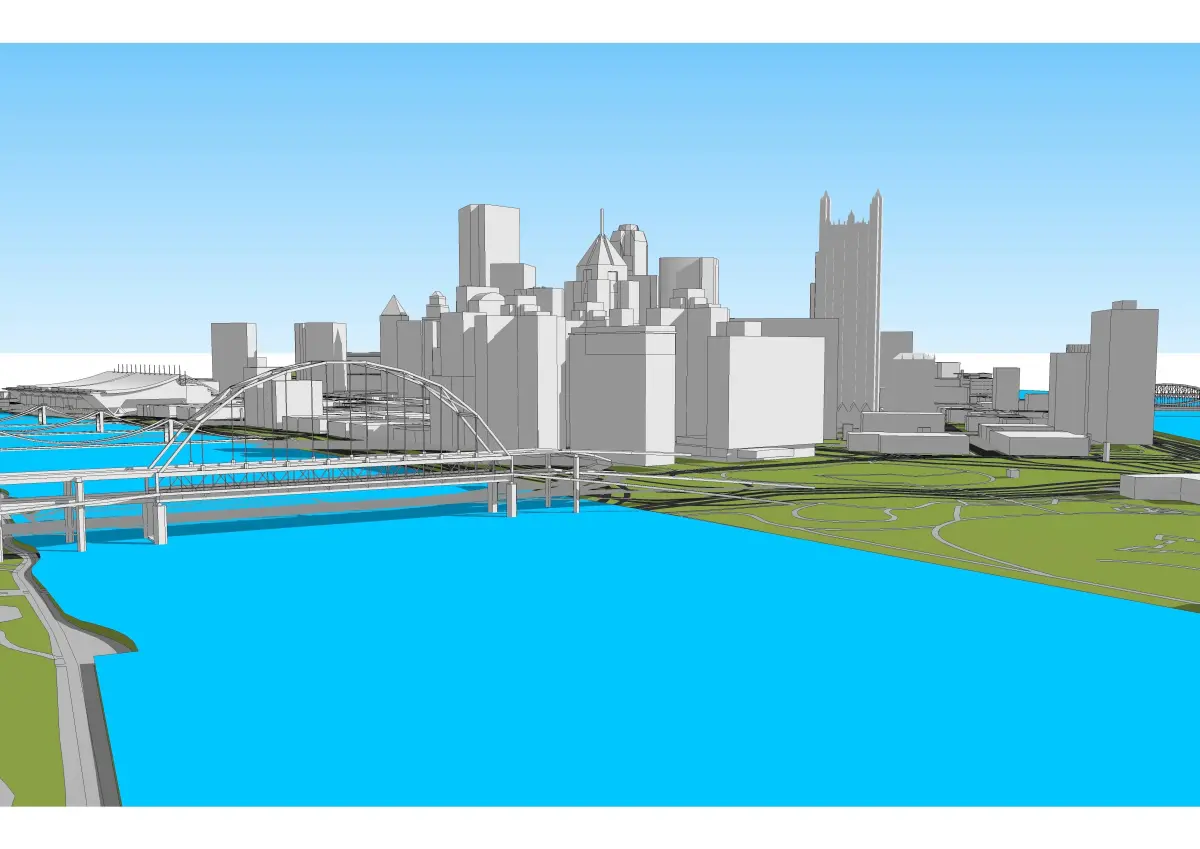 Massing model of downtown Pittsburgh Pennsylvania. The model was developed with Sketchup and exported to Blender. Additional file formats from Blender are included above. Images were created in Sketchup.