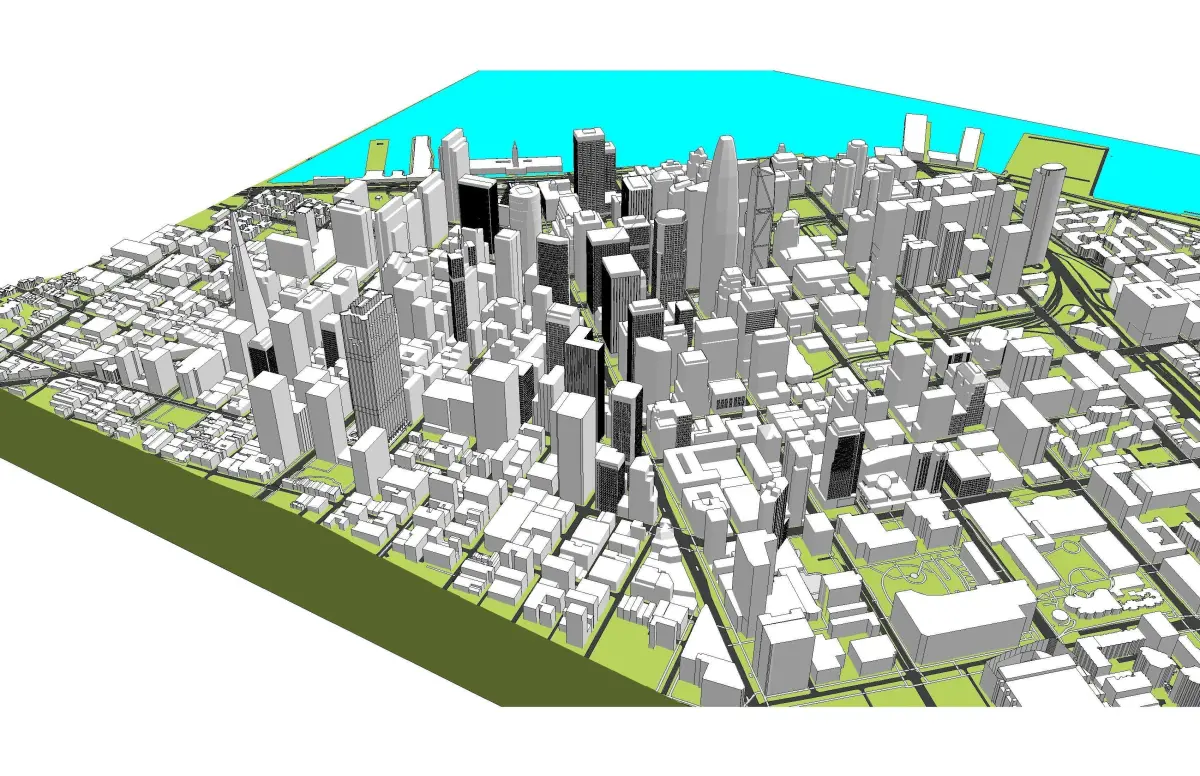 This model consist of one image file/tile with the buildings, roads, paths, water drapped onto the surface. The model was created and intended as a massing model. Interior building details are not included and the model was not created for 3d printing.