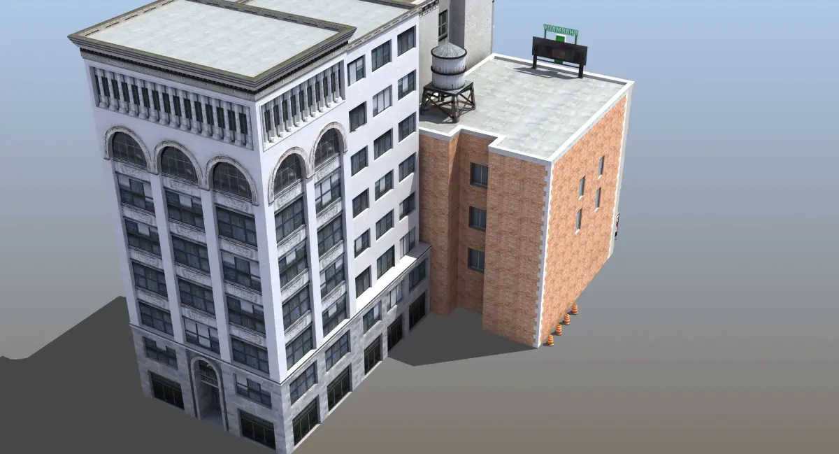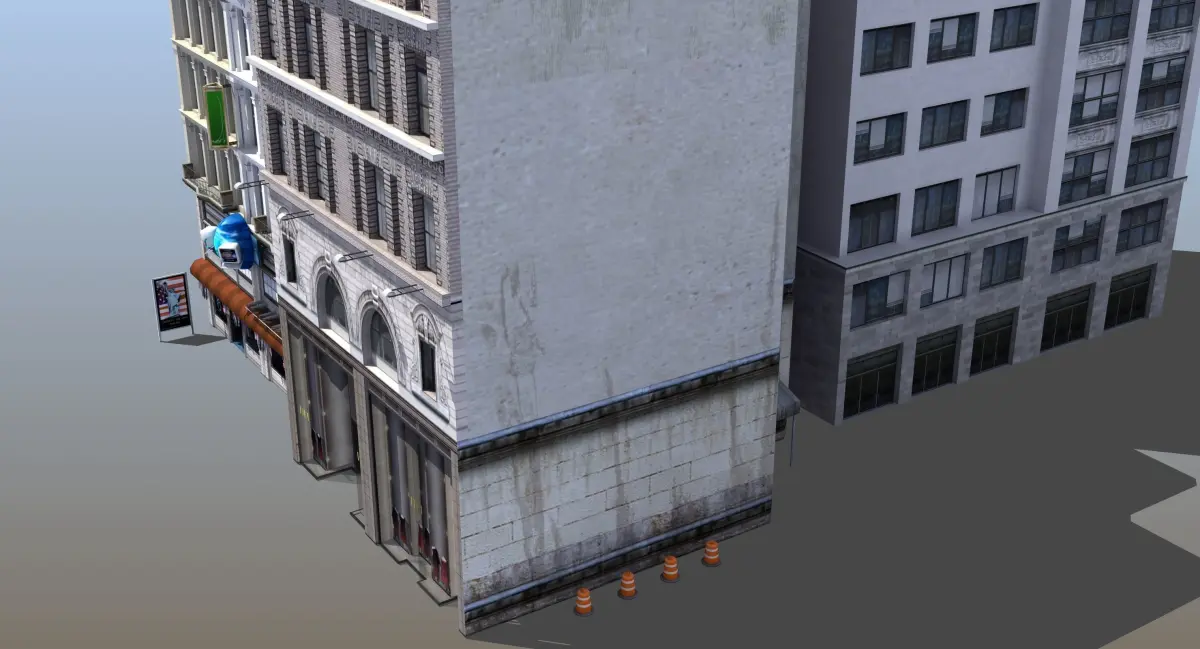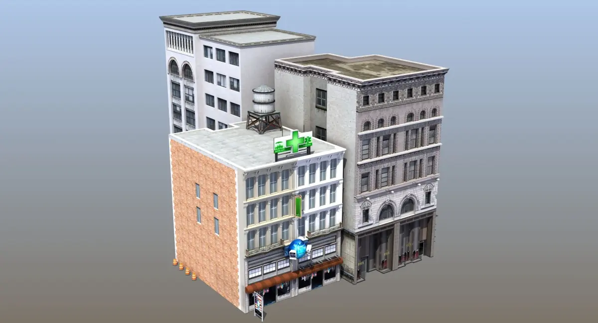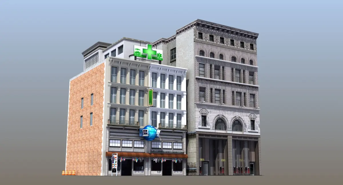 Downtown Stores model set. Great multipurpose 3D model (ideal for offline rendering or real time uses such as games or simulation).