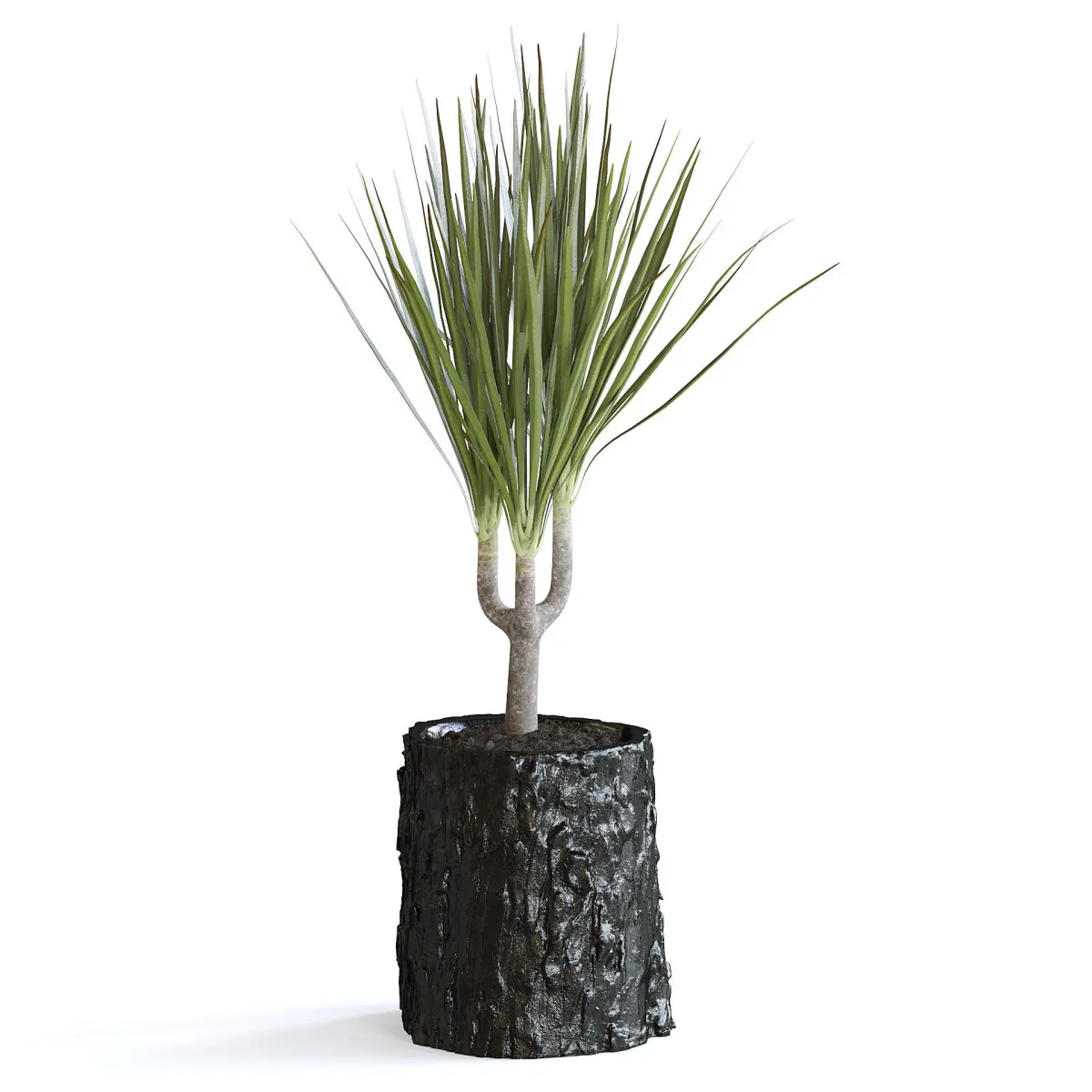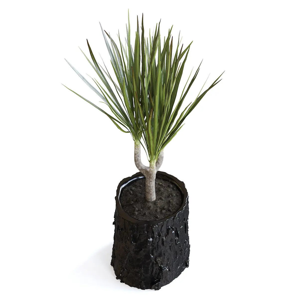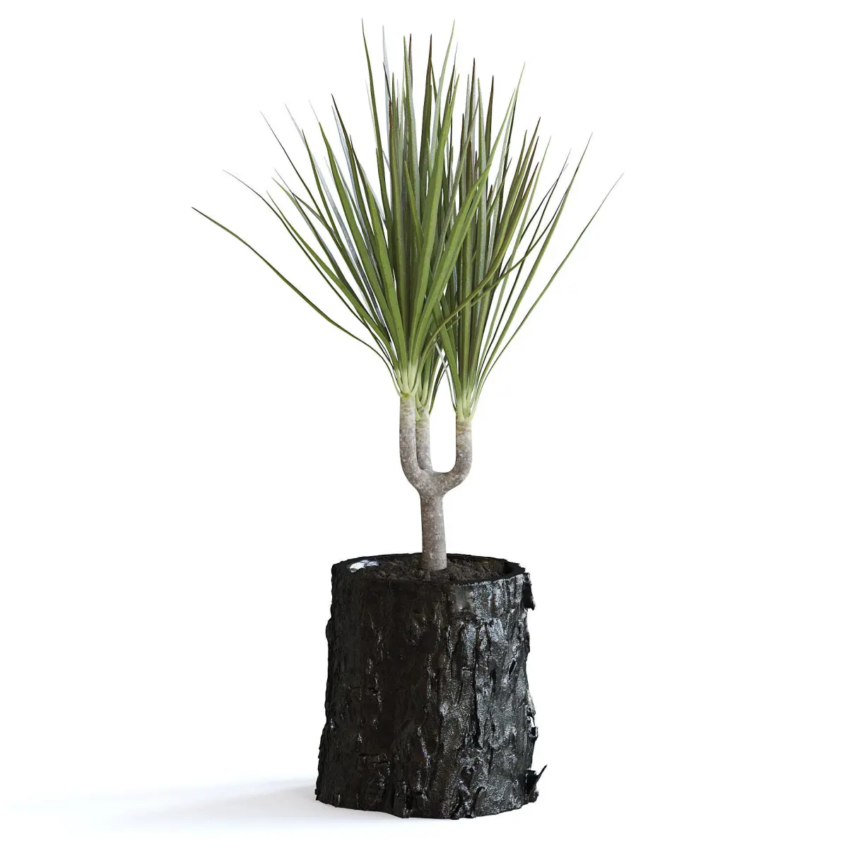 Dracena plant in a black wood log stylizied pot.