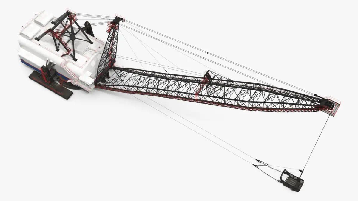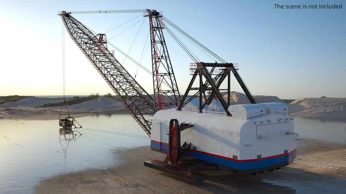 Dragline Excavator Mining Machine White is a three-dimensional model of long boom mining excavating machine, also known as an open pit dragline excavator.