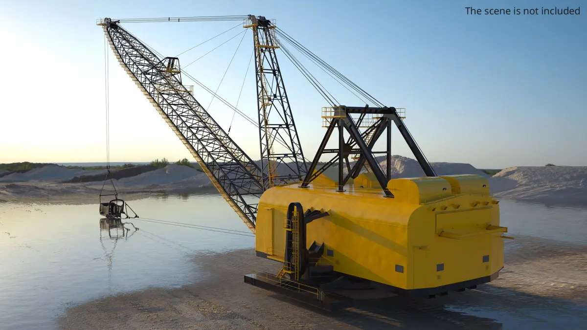 Dragline Excavator Mining Machine Yellow is a three-dimensional model of long boom mining excavating machine, also known as an open pit dragline excavator.