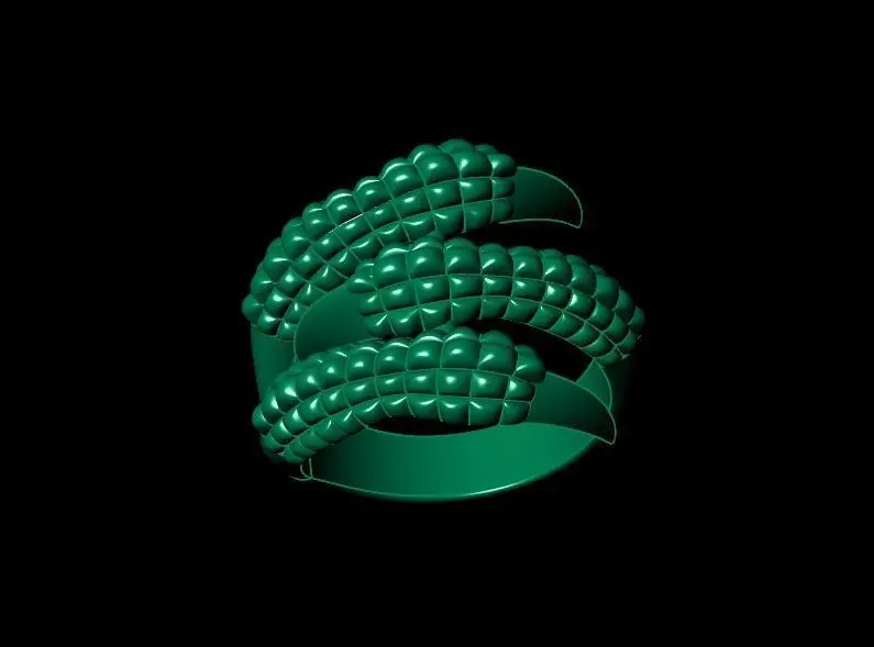 These images display a 3D design of a ring with corn-like features. The primary structure consists of what appears to be three stylized corn cobs, symmetrically arranged, creating a visually dynamic piece of jewelry. The texture of the corn kernels is exaggerated to form a bold, tactile appearance, while the overall design maintains a smooth and shiny surface. The corn kernels' rounded, geometric shapes give the design an organic yet futuristic look. The ring band supports the corn cobs, merging seamlessly with their structure. The deep green color adds to its distinct aesthetic.