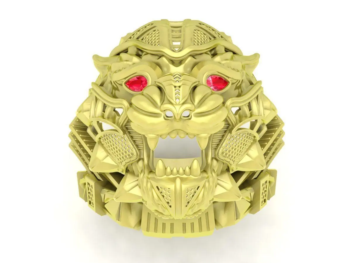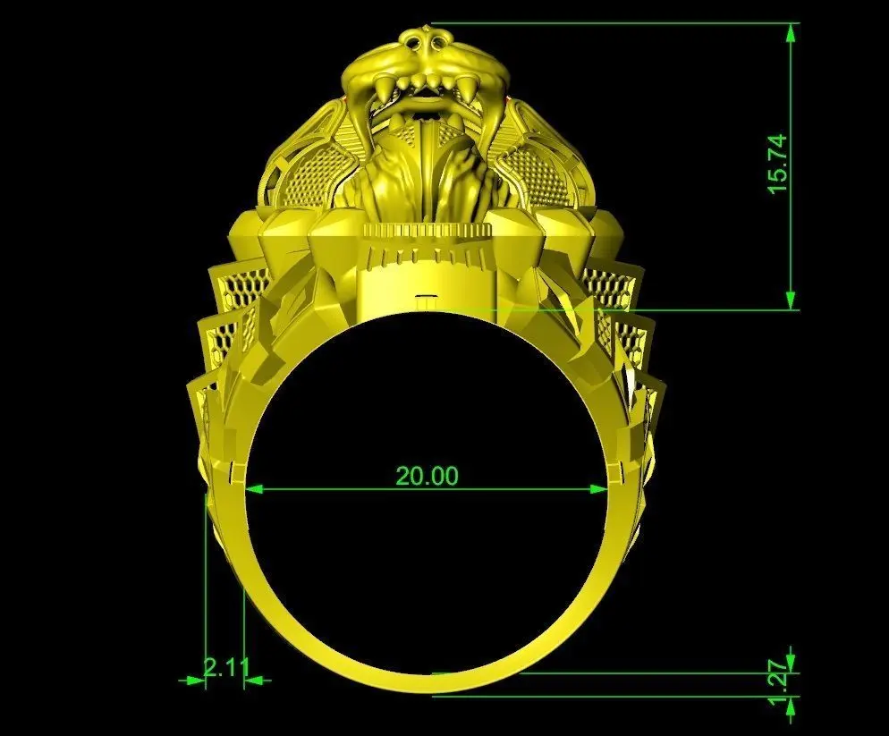 This 3D model showcases a highly detailed dragon head ring designed for premium jewelry production. The ring features an intricate sculpted dragon face with layered scales, sharp contours, and gemstone-set eyes that create a powerful and dramatic visual impact. Each part of the design—including the crown, teeth, texture patterns, and under-gallery—has been carefully crafted to ensure excellent definition during casting.