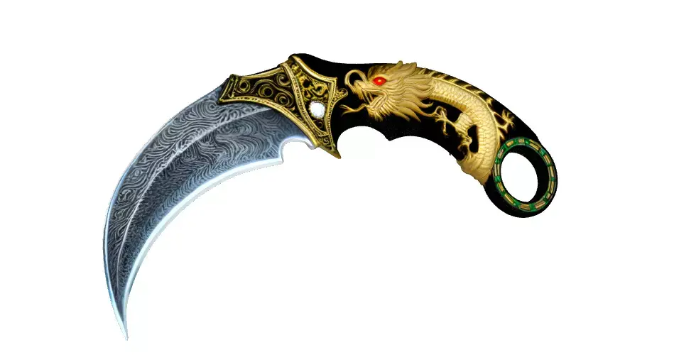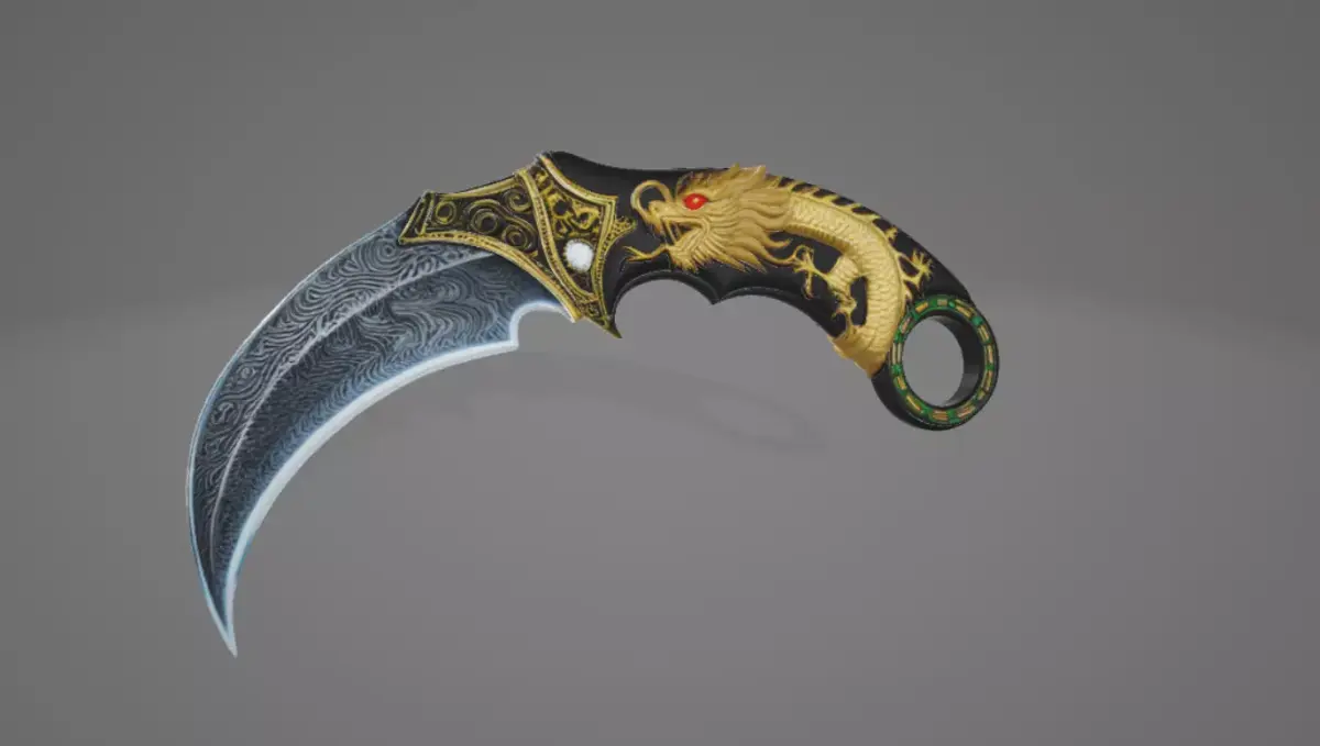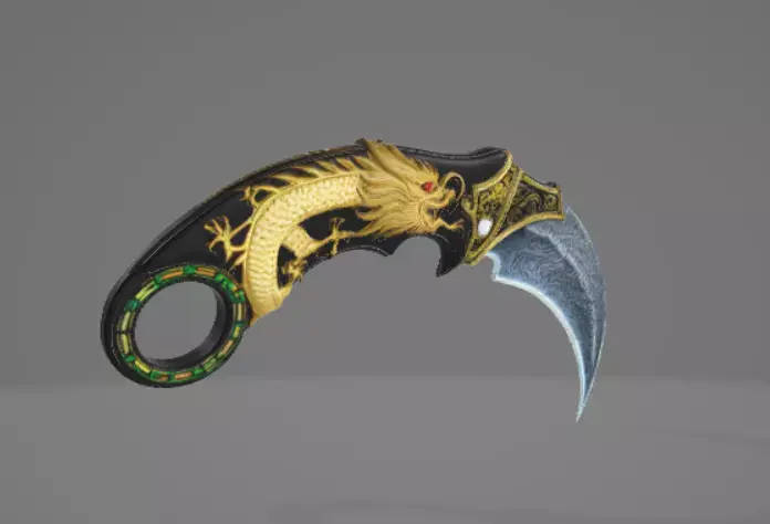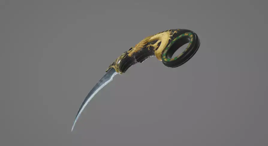 The Golden Dragon Karambit 3D Model is a highly detailed fantasy weapon inspired by mythical dragon symbolism and ancient ornamental craftsmanship. Featuring an intricately sculpted golden dragon embedded into the handle, glowing red eye detail, and engraved blade patterns, this weapon delivers a powerful and elegant fantasy aesthetic.The blade showcases detailed surface engravings resembling Damascus steel, while the handle combines black and gold materials with decorative gemstone accents, creating a premium, legendary weapon appearance.