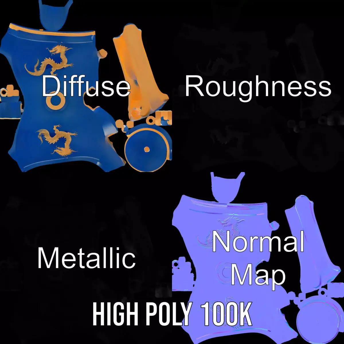 Experience the elegance of the Dragon Porcelain Teapot model pack, designed with intricate golden dragon details on a vibrant blue ceramic texture. Ideal for use in animated films, interior design visualization, and virtual reality experiences, this model brings a touch of luxury and tradition to any project. Each model has 3 levels of detail: low-poly (1000 triangles for mobile), middle-poly (10,000 triangles for environment), and high-poly (100,000 triangles), which allows for the use of this model in production rendering (such as 3ds Max, Maya, Cinema4D, Blender, Vray/Corona/Cycles and all other), game engines (Unity and Unreal compatible), and interactive presentations, providing a choice of detail based on the LOD System principle. The model's textures are PBR, Diffuse, NormalMap, and reflection/roughness/metallic, which are suitable for any modern rendering engine. All models are accurately unwrapped and have no overlapping UV. Textures are 4096*4096 in size. If you enjoyed this model, please like and leave a comment.