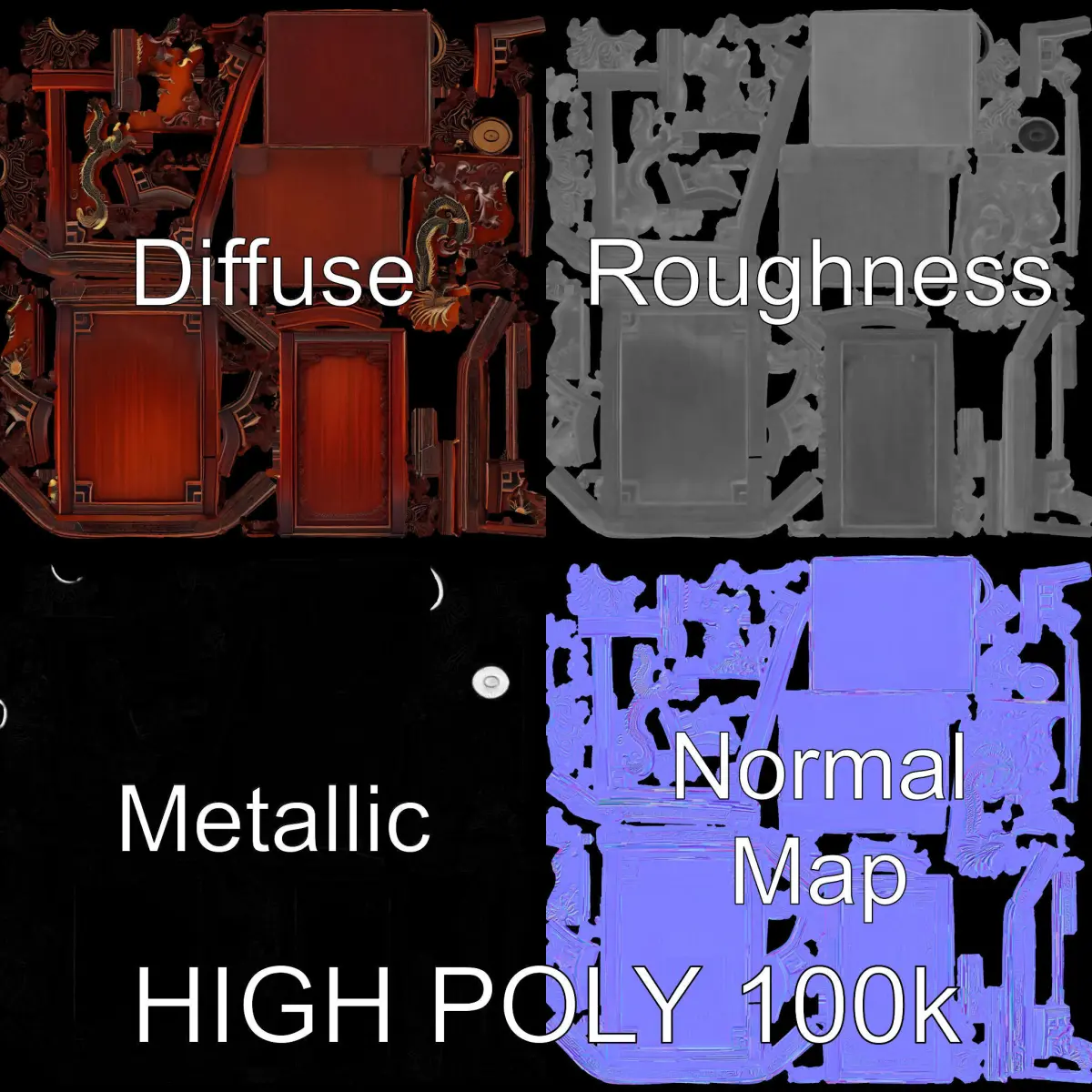 This dragon relief wooden cabinet 3D model pack includes three levels of detail: low-poly for mobile with 1000 triangles, middle-poly with 10,000 triangles for environment, and high-poly with 100,000 triangles for production rendering in platforms like 3ds Max, Maya, Cinema4D, and Blender. Perfect for gaming in Unity and Unreal, and for interactive presentations, this model features realistic PBR textures with diffuse, normal map, and reflection/roughness/metallic options, all sized at 4096x4096. The cabinet's intricate dragon carvings and traditional design make it ideal for historical simulations, cultural displays, or fantasy-themed environments. All models are accurately unwrapped with no overlapping UVs. The first image is the reference used for creating the 3D model. It is important to carefully evaluate the quality of the model by examining the preview images that display the topology and polygonal mesh. These previews (WIRE and WEB 3D Preview) clearly demonstrate how accurately the model matches the original reference and how well the geometry has been executed. Please like and leave a comment if you enjoyed this model.