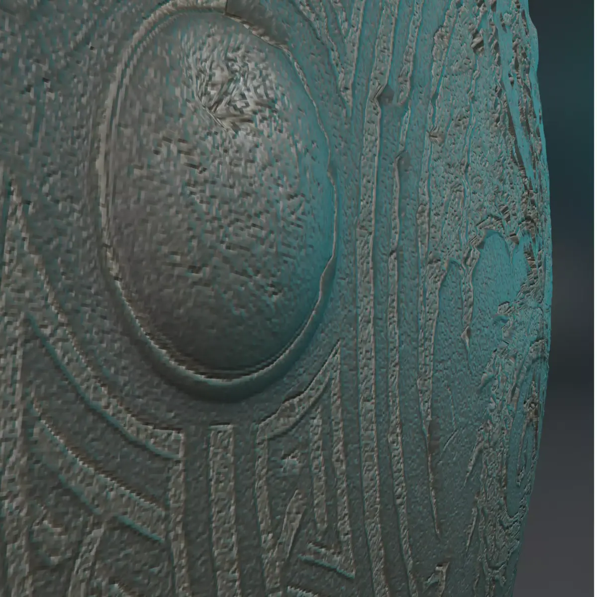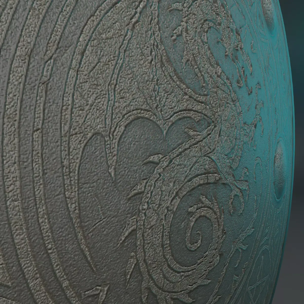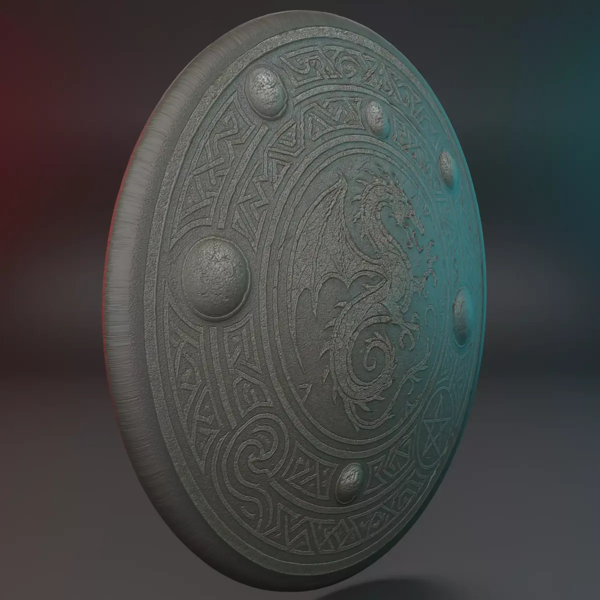 A detailed 3D model of a dragon-engraved medieval shield, including PBR textures (BaseColor, Roughness, Normal). Ready for rendering and game engines.