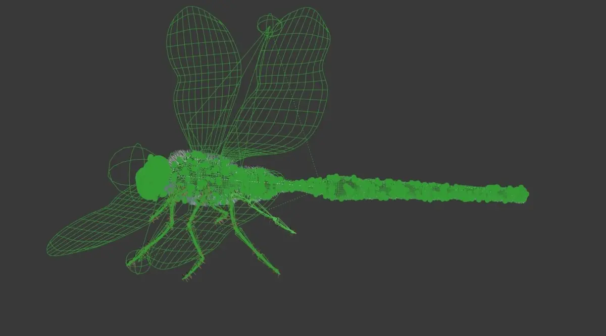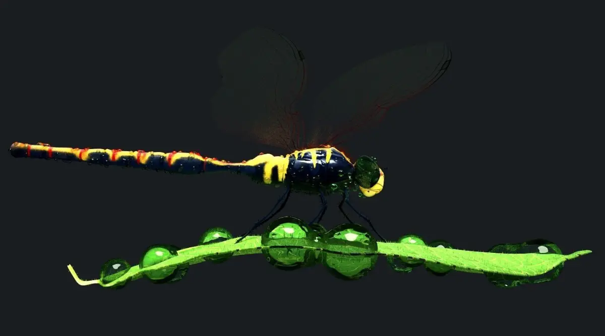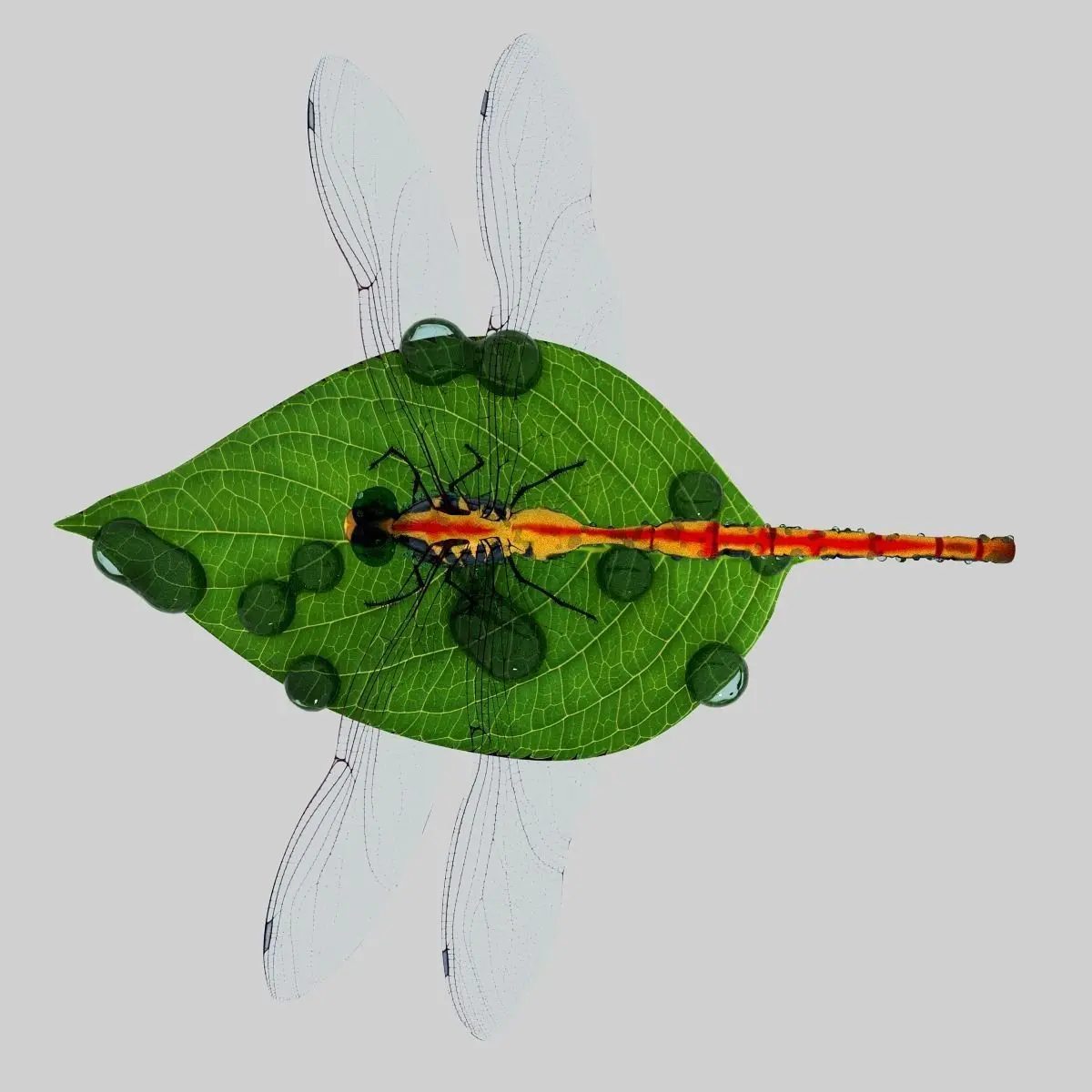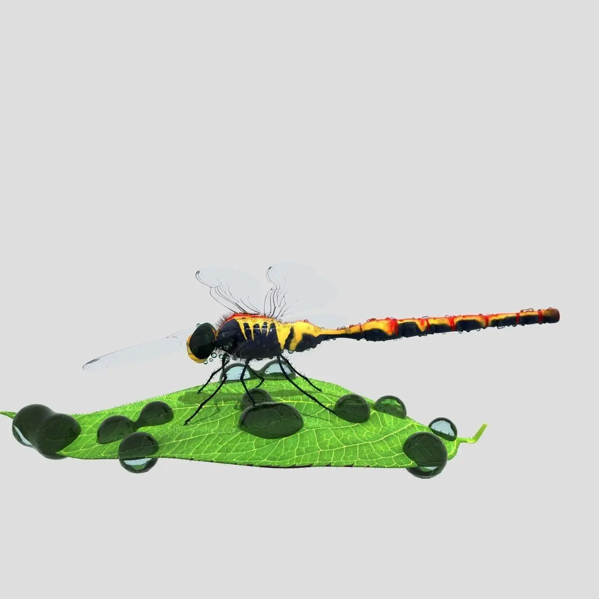 Dragonfly on a leaf with drops of water. The model does not present a really existing genre, but is inspired by such genres. Model have rigged legs