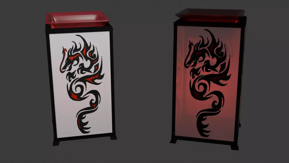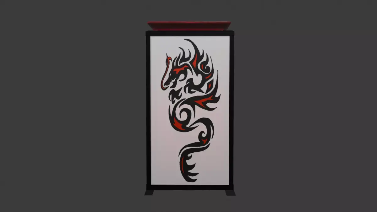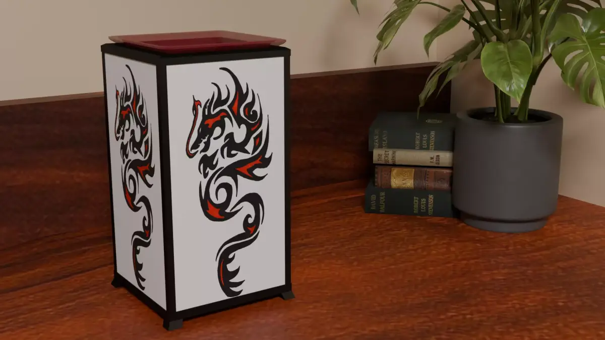 A dragon-themed wax warmer with a distinctive black metal frame and four semi-transparent milk glass shades featuring detailed dragon motifs. At the center, a red light source glows through the frosted glass, casting a warm, fiery ambiance in low light. The combination of dark metal and soft illuminated glass gives the piece a dramatic, mystical presence suited for fantasy or gothic-inspired interiors. The model is built with clean topology and realistic materials, including subtle translucency on the glass to simulate light passing through. Perfect for interior renders, fantasy scenes, or decorative asset collections.