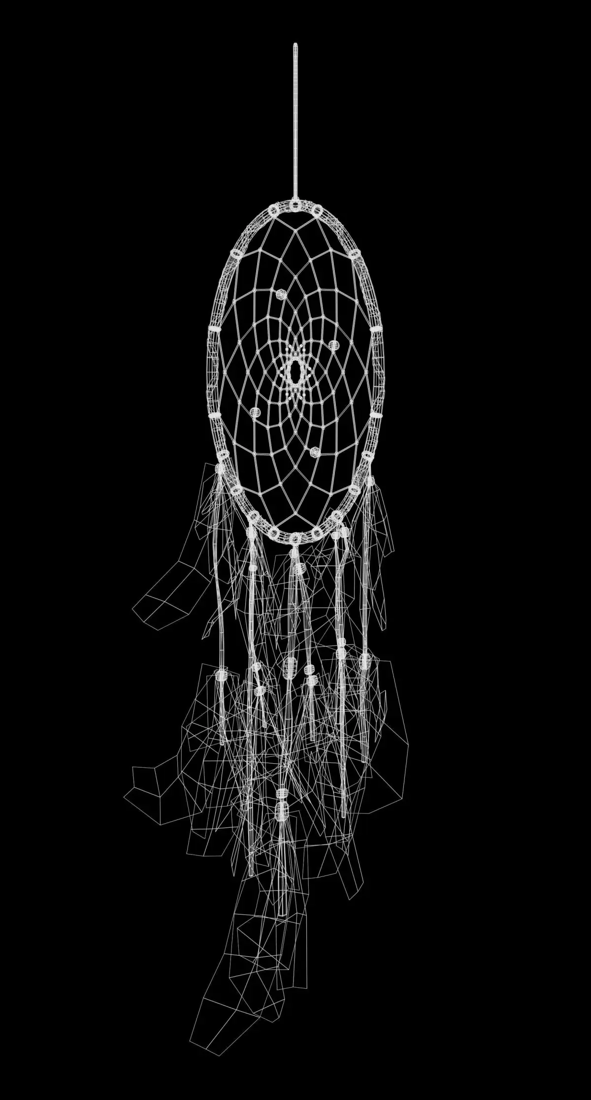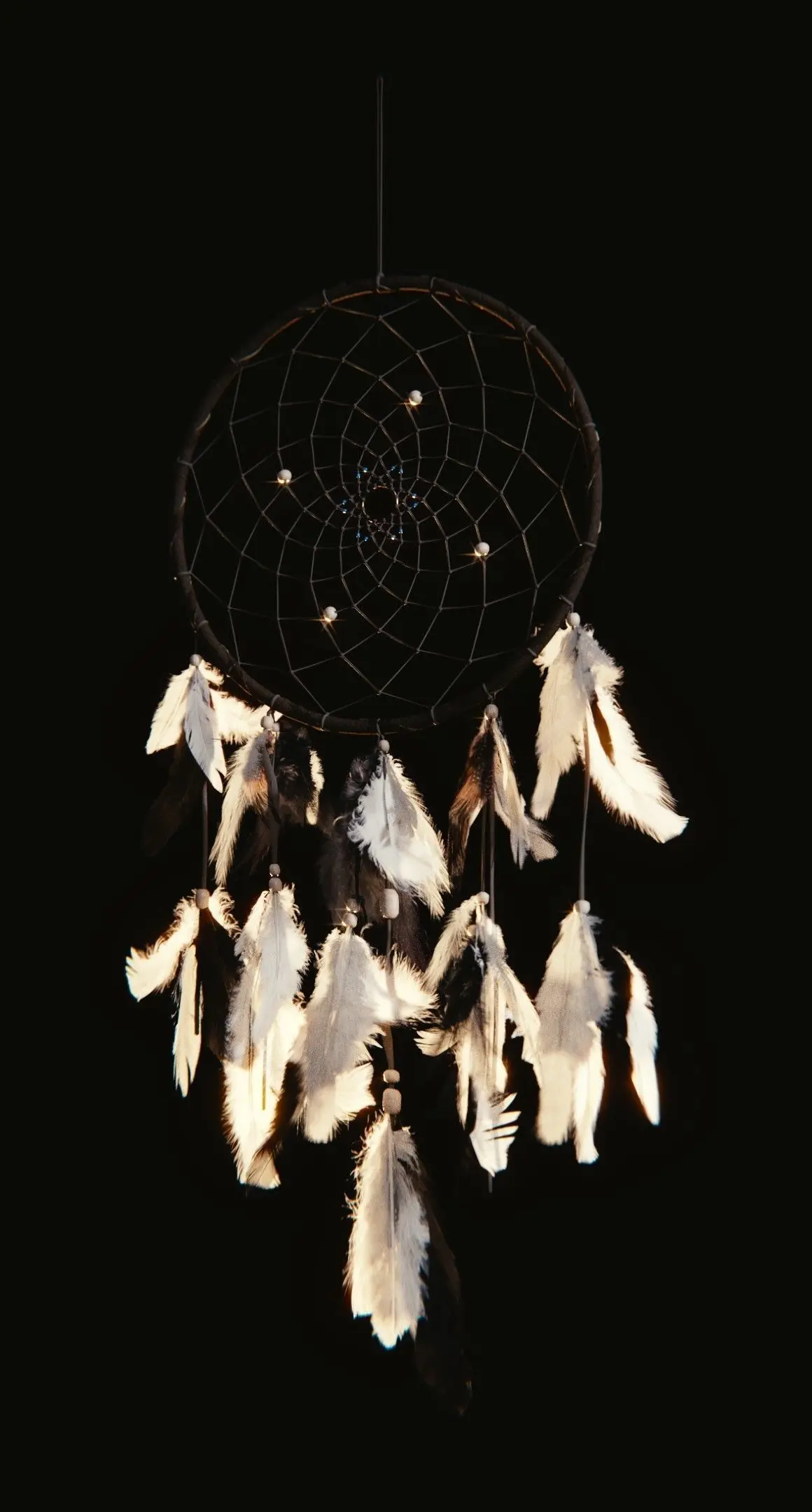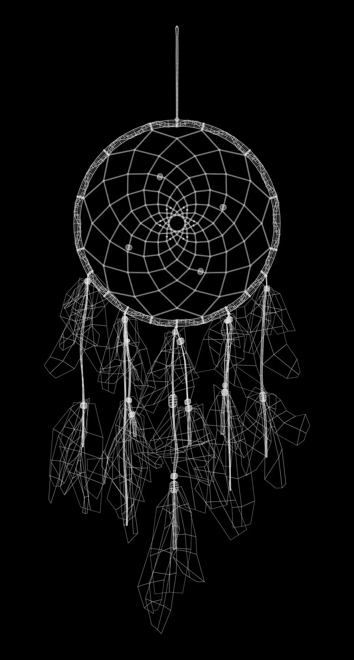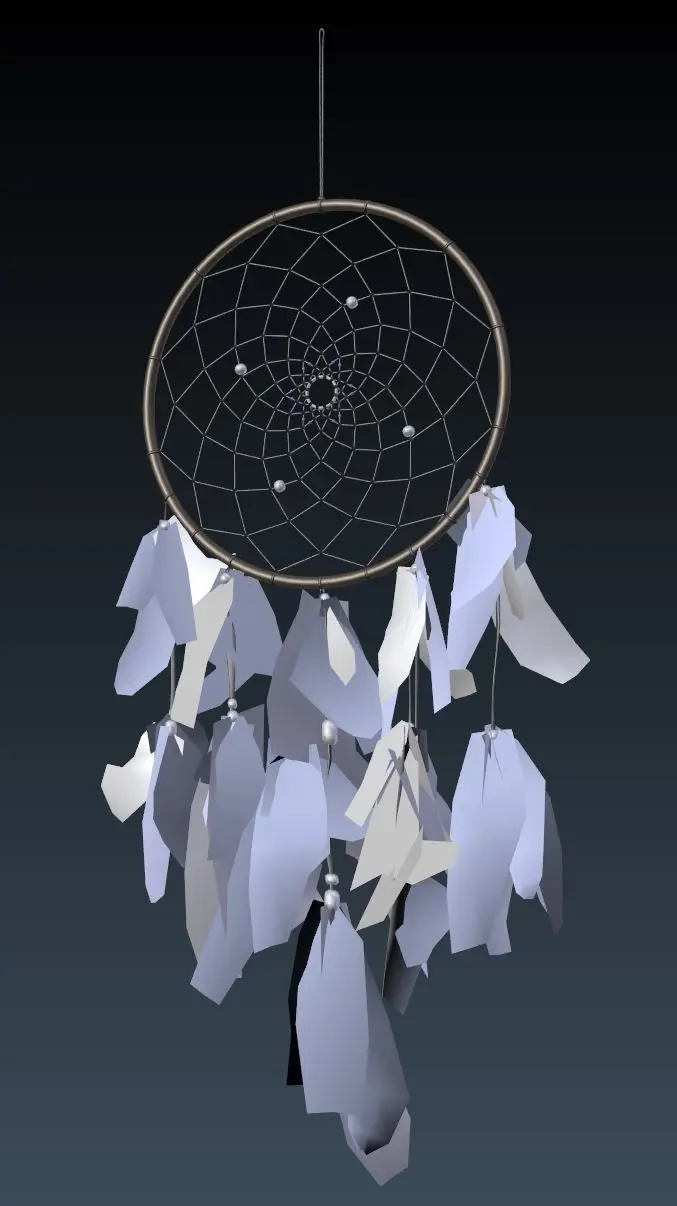 The model is partially UV mapped with textures being used for the feathers while simple materials and procedural noise textures are used for the frame, string, and beads.