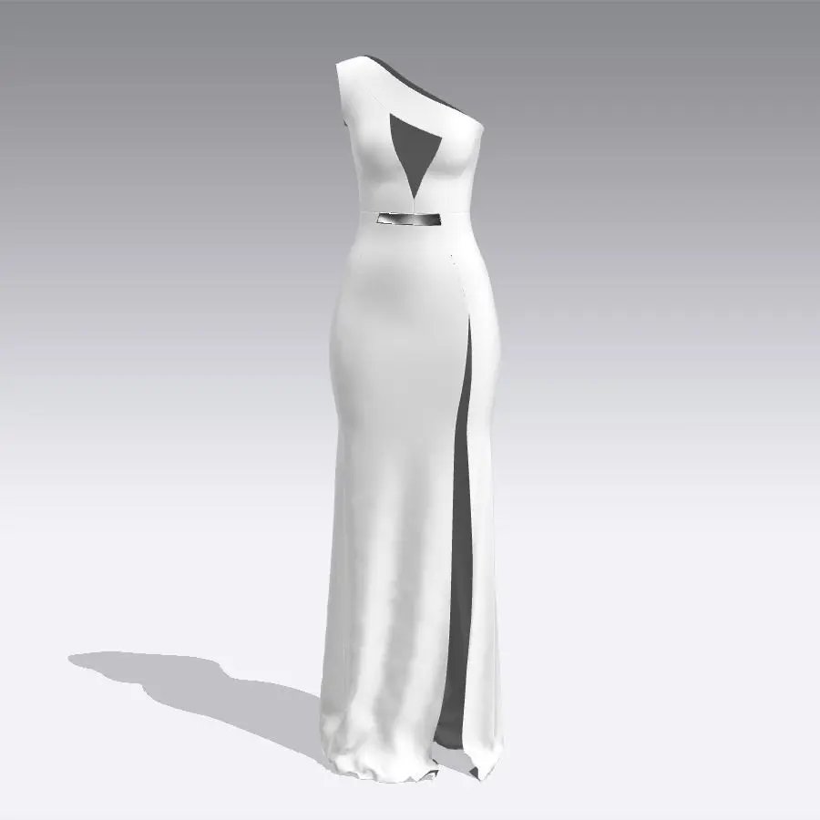 DRESS ONE SHOULDER CENTER WINDOW BLOUSE AND METALIC BELT NECKLINE COLOR WHITE FABRIC MATTE TYPE DETAIL SLIT SKIRT DRESS STYLE FASHION CLOTHES LOOK ART ELEGANCE WEAR TREND T