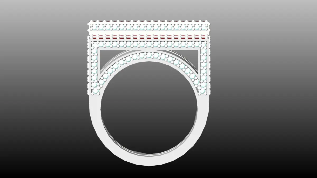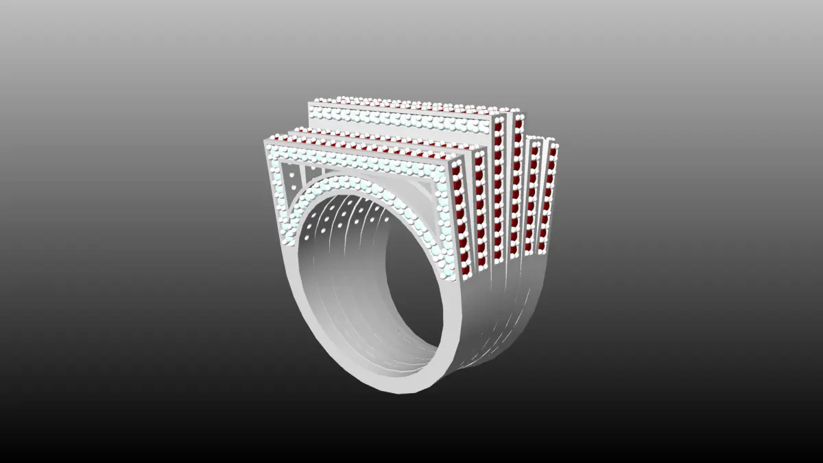 A fancy dress ring for any occasion where you want to make a statement. The stones are rendered as ruby and diamond but any colour would stand out with this elegant design.