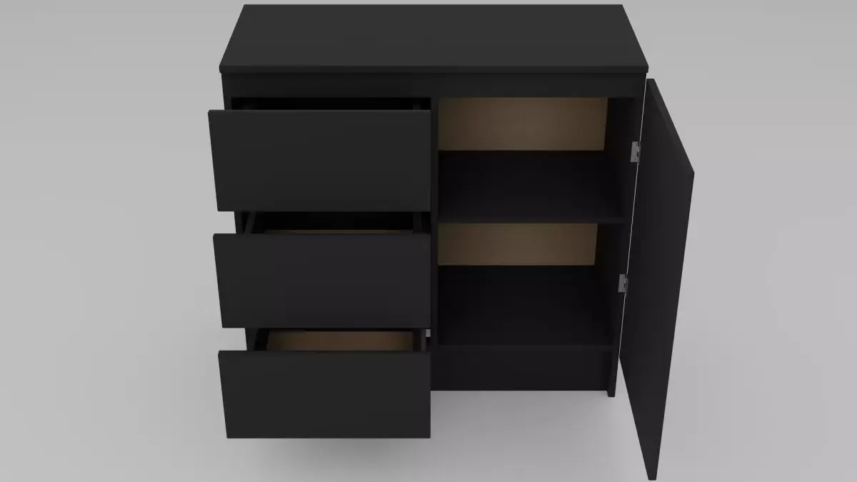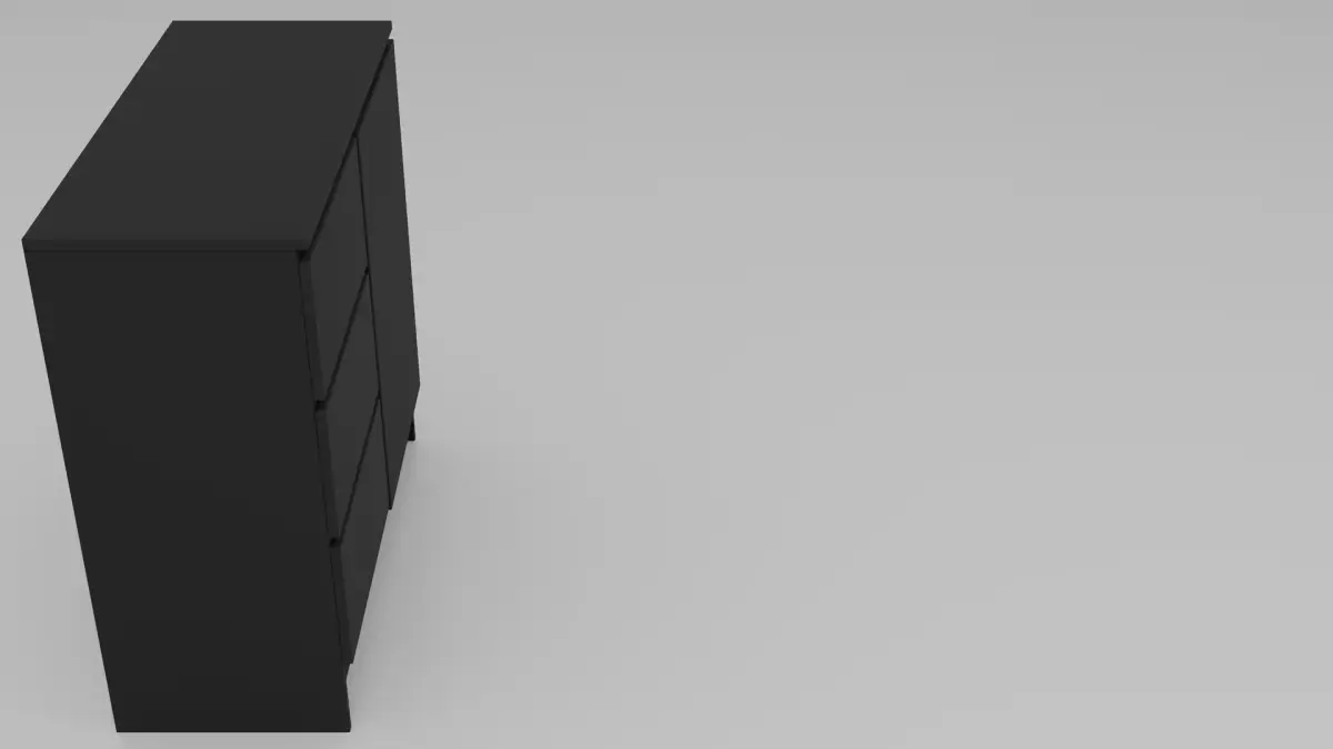 This stylish dresser impresses with its modern, minimalist design in elegant matte black. It features three spacious drawers and a practical door, providing versatile storage for clothing, everyday items, or accessories. The fine matte surface ensures a sophisticated look and blends seamlessly into various interior styles – from industrial to modern classic. For added realism, special attention was paid to authentic construction details: visible hinges on the door as well as finely modeled screws highlight the high-quality craftsmanship and give the model authenticity and depth. Clean edges, subtle joints, and realistic proportions make the dresser an ideal asset for interior visualizations, product presentations, or game environments. The combination of functionality and aesthetic simplicity makes this 3D model a perfect addition to sophisticated design projects.