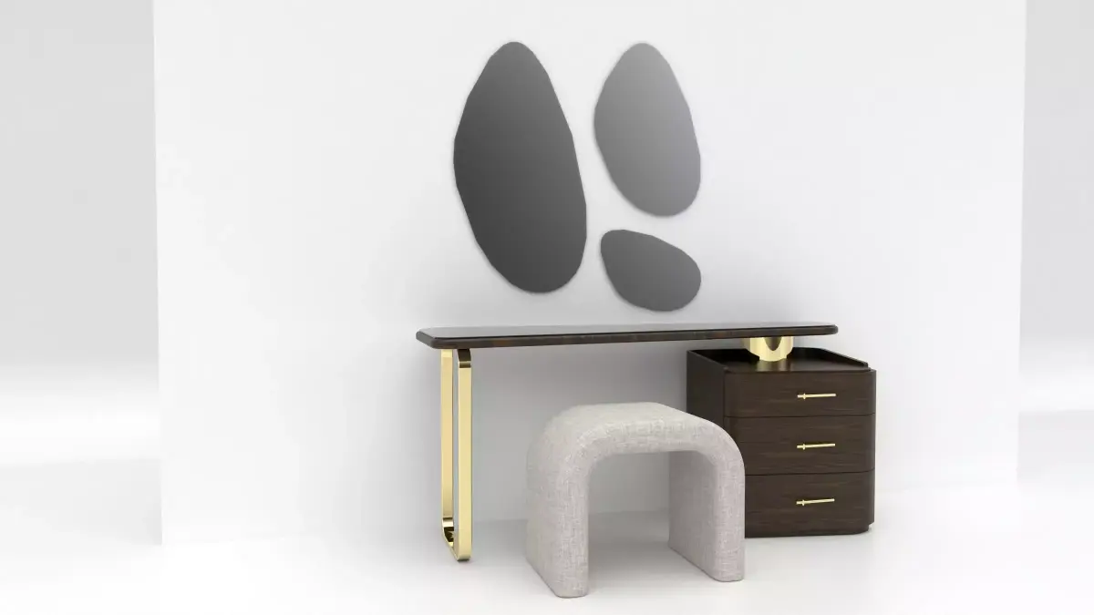 The set includes a uniquely shaped upholstered stool with soft fabric texture, perfectly complementing the clean lines of the console. Minimal wall décor elements complete the composition, making this model ideal for bedroom vanity setups, luxury entryways, dressing areas, and high-end interior visualizations.