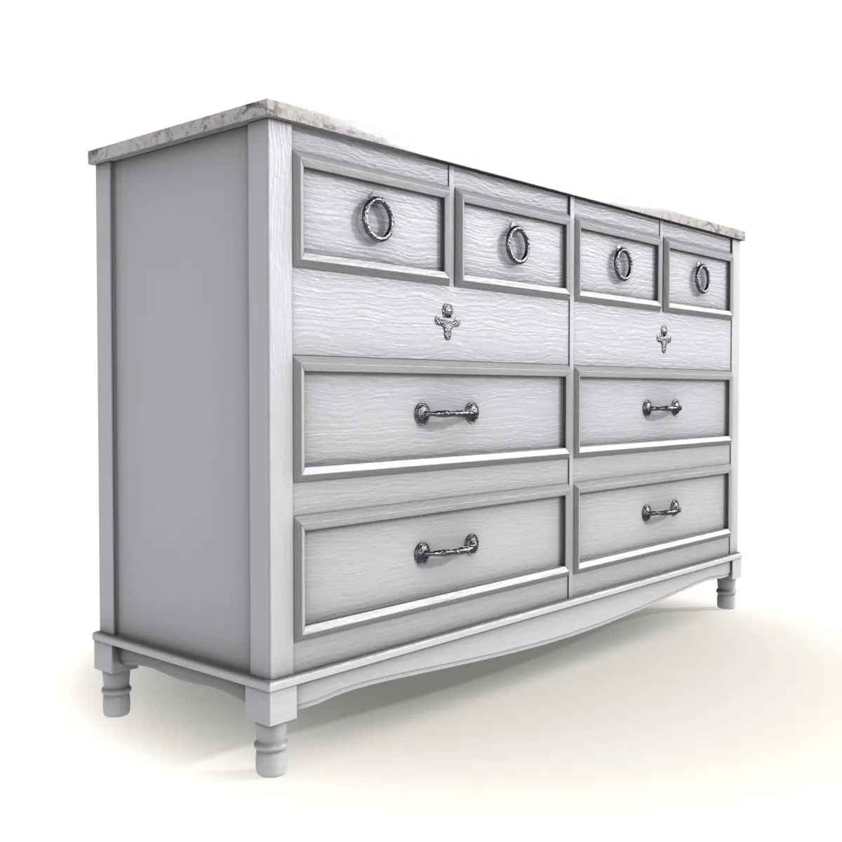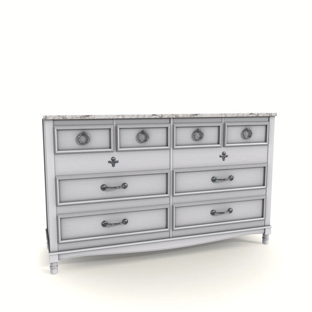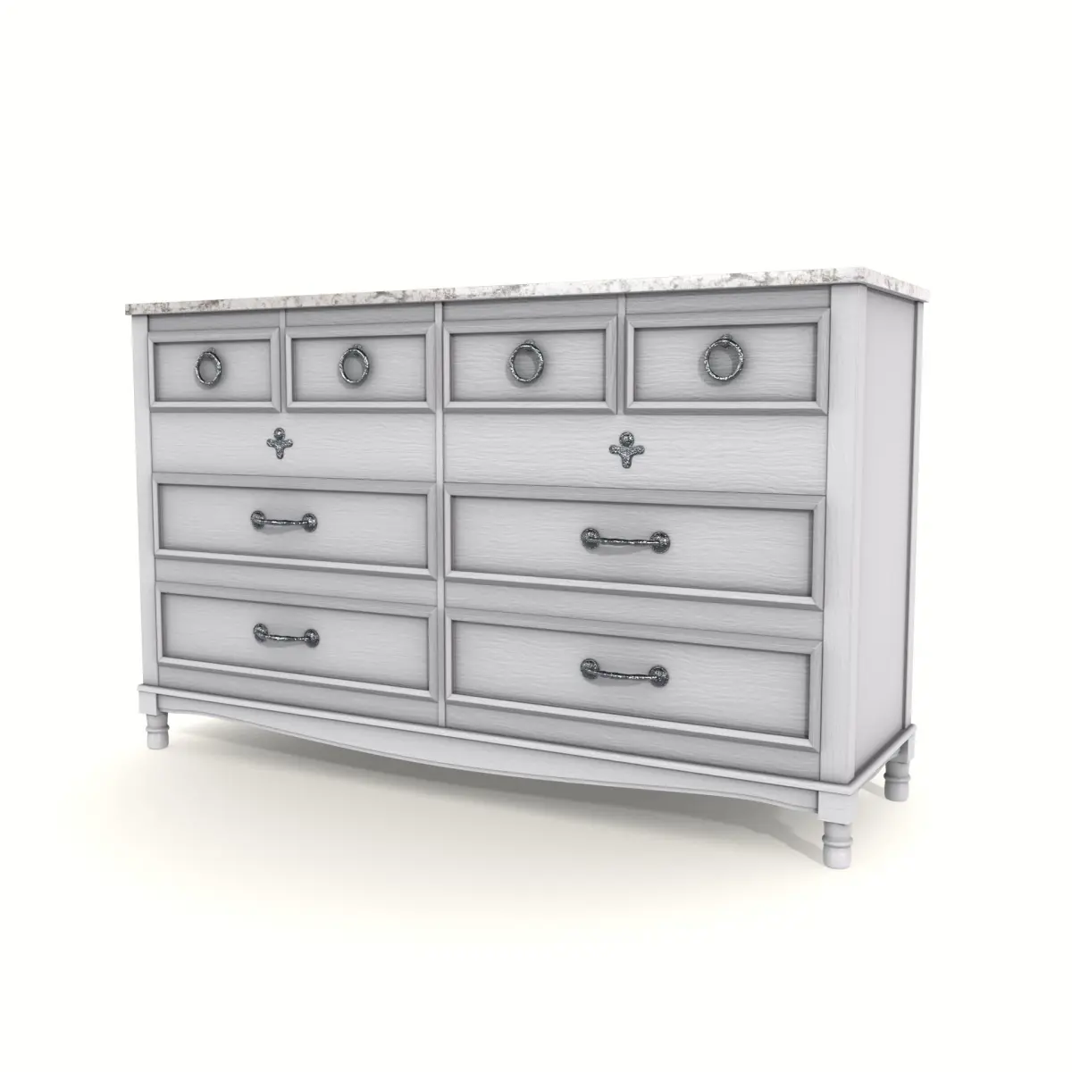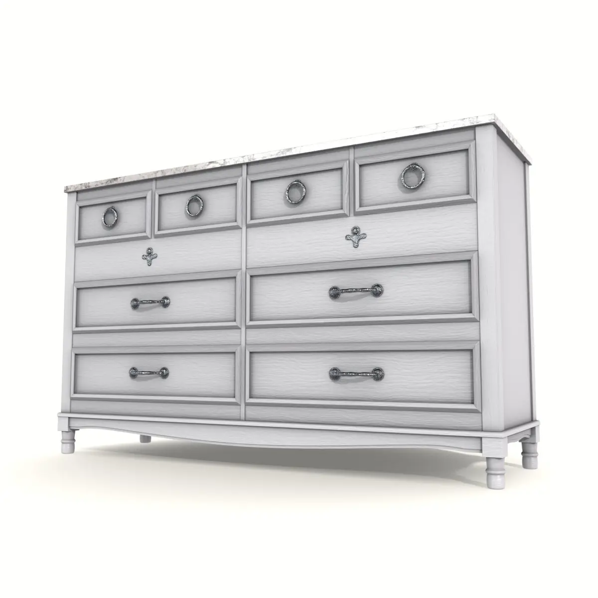 Transform your bedroom into a cozy and romantic retreat with this shabby chic dresser. Its distressed white finish and decorative floral carvings exude vintage charm. The dresser is crafted from solid pine wood, ensuring sturdiness and durability. It features five drawers with intricate metal pulls, offering ample storage for your belongings. The structure is elegant and feminine, with curved legs and a scalloped apron that enhance its shabby chic appeal. This dresser brings a touch of nostalgic beauty and vintage elegance to your space.