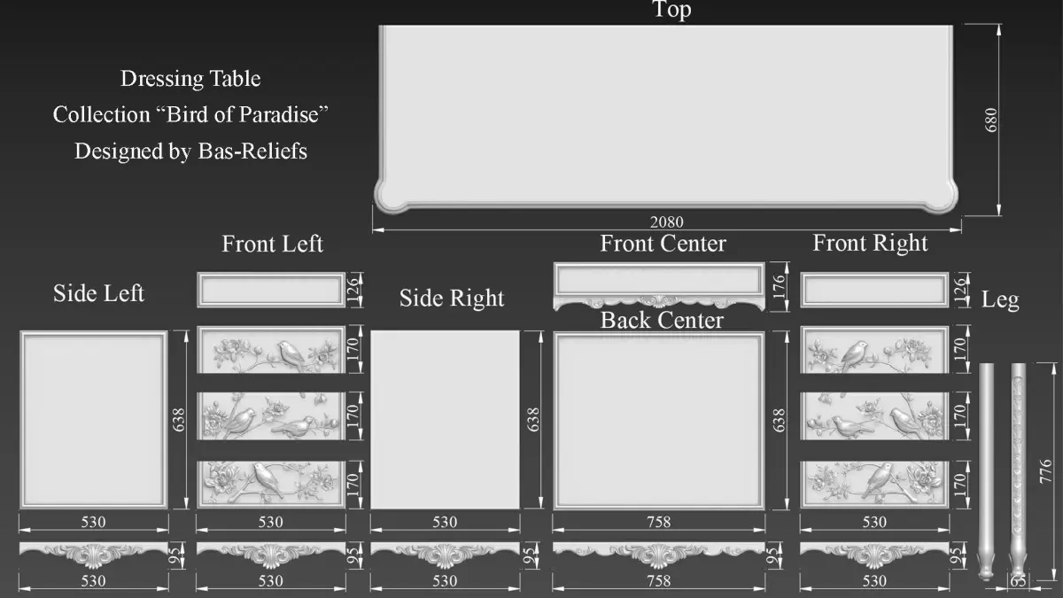 The archive contains files in STL and OBJ formats, only the external parts that you see in the preview with dimensions.The archive does not include parts inside the product such as the building part, drawers inside, fastenings, etc.High-poly 3D Model.Model has a native size shown below but can also be scaled up or down inside your software. General dimensions of the product after manufacture: 2080x680x810mm. See the preview for dimensions of individual parts.