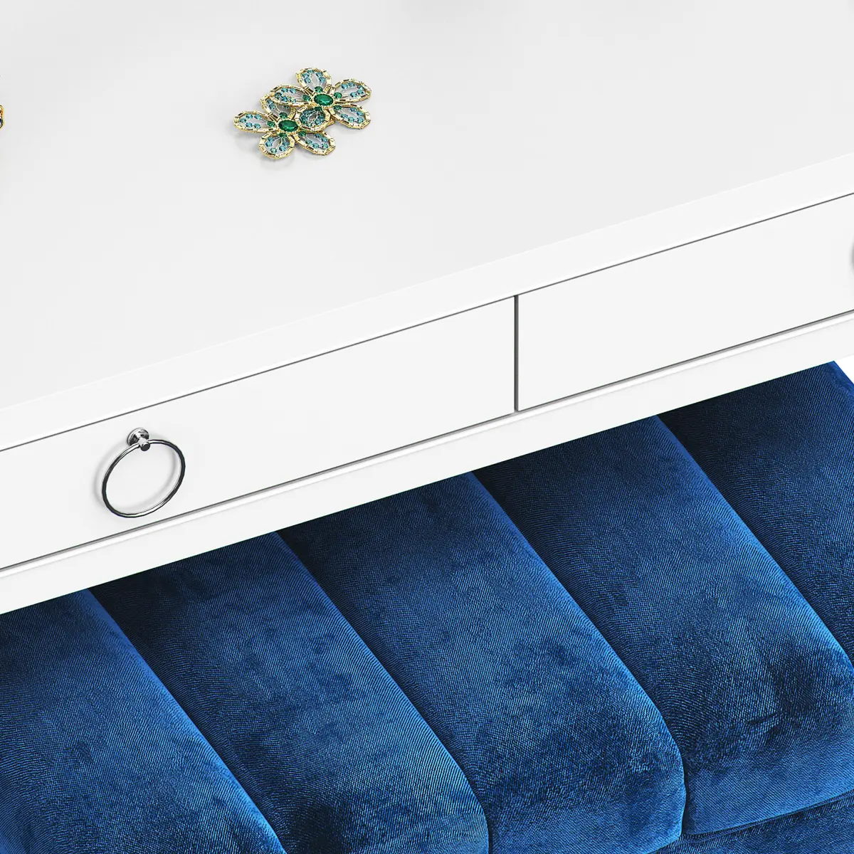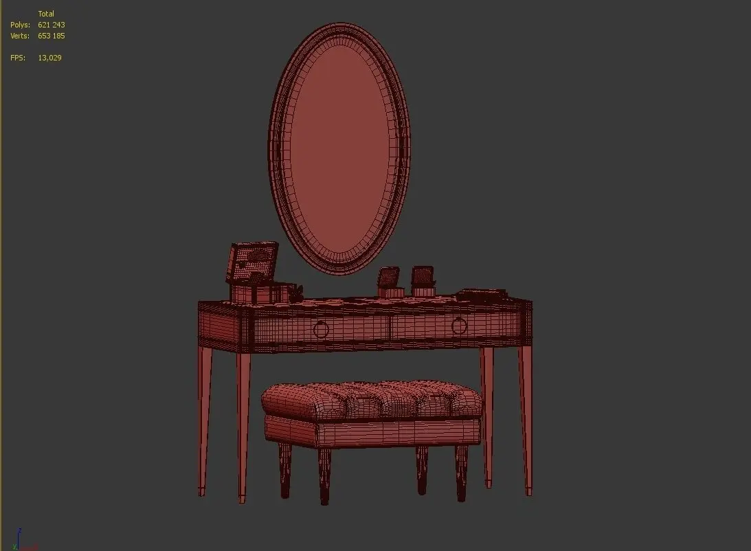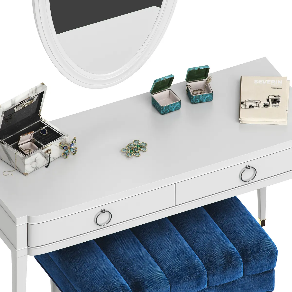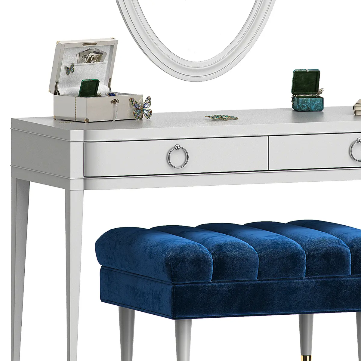 The model includes: wall mirror, dressing table, decorative set, bench by eichholtz.