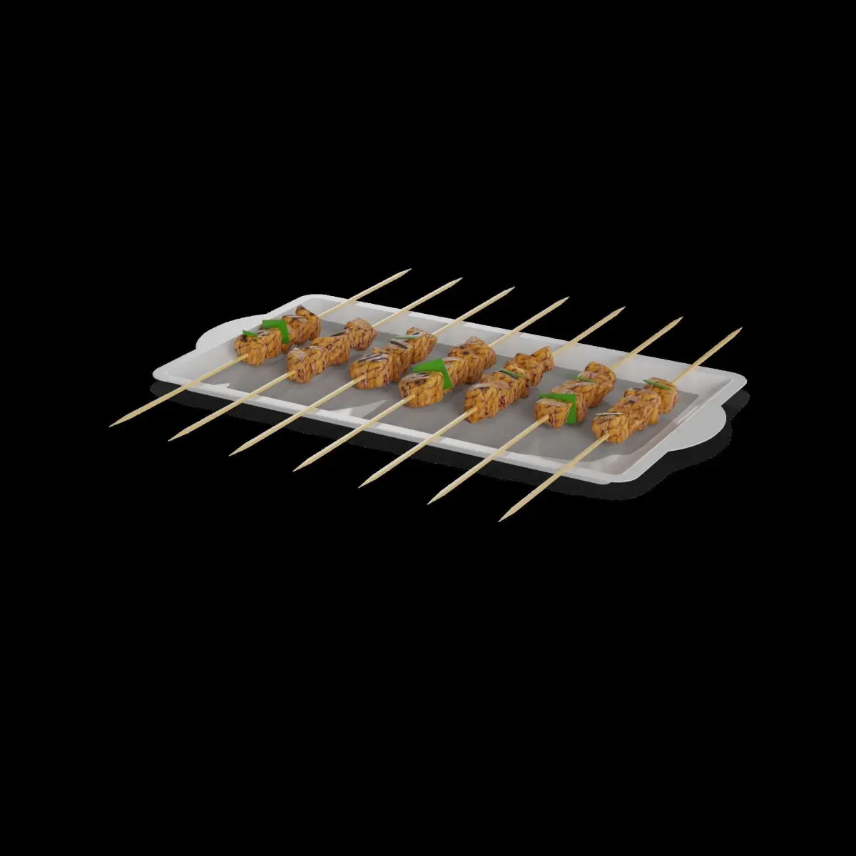 Chicken Satay Skewers: Delicious chicken satay skewers packed in a rectangular plastic tray. The packaging has a tropical green and yellow color scheme, with a label featuring a picture of skewered chicken and the text Chicken Satay Skewers in bold, exotic font.