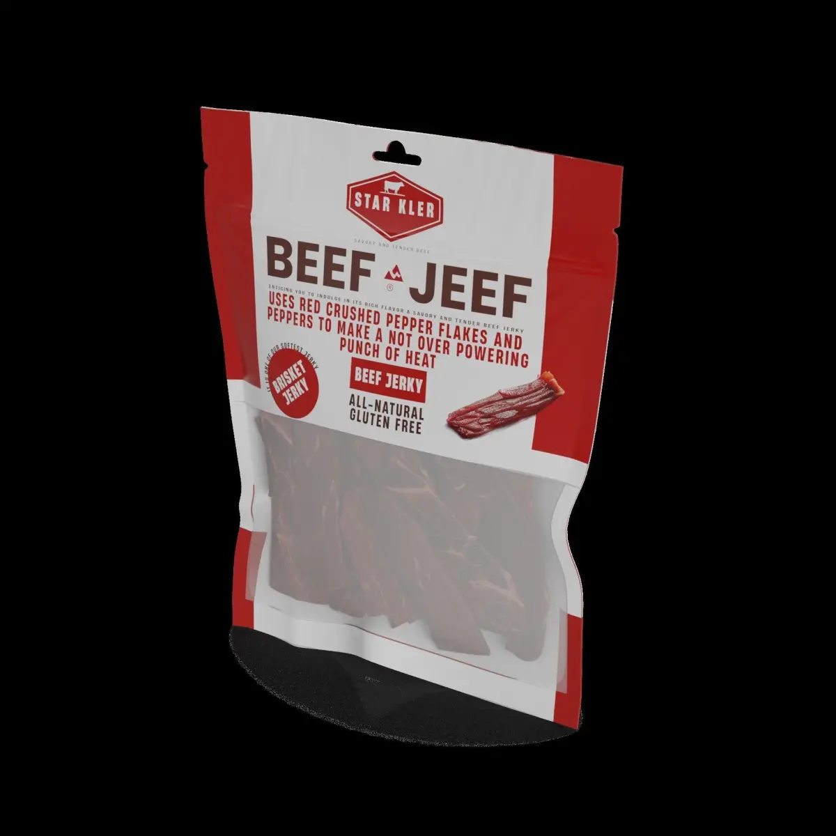 Dried Beef: A savory and tender beef jerky, packed in a resealable plastic bag. The packaging features a bold red color scheme with a picture of a juicy steak, enticing you to indulge in its rich flavor. The bag includes a label with the text High Protein Snack and a graphic of a muscular arm to highlight its nutritional benefits.