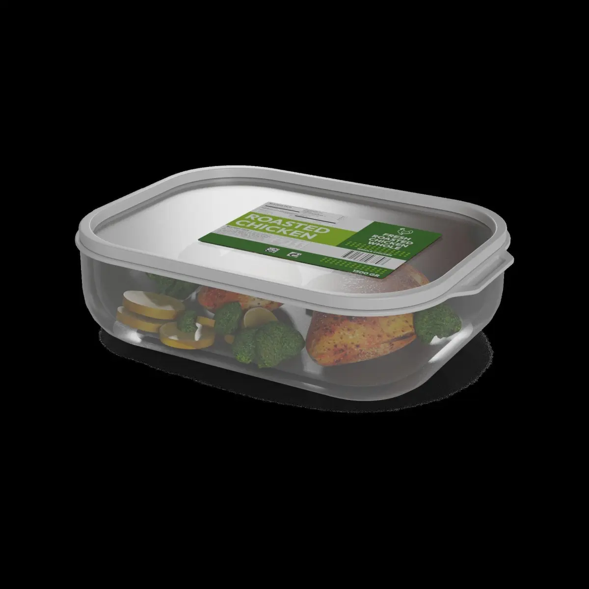 Roasted Chicken Breast: Enjoy the tender and flavorful roasted chicken breast with this convenient packaging. The container is a clear plastic tray with a peel-off lid, allowing for easy access to the succulent chicken slices. The tray is labeled with a vibrant green sticker, featuring an image of a roasted chicken and the product name. A No Preservatives text label is prominently displayed, along with the weight and serving size information.