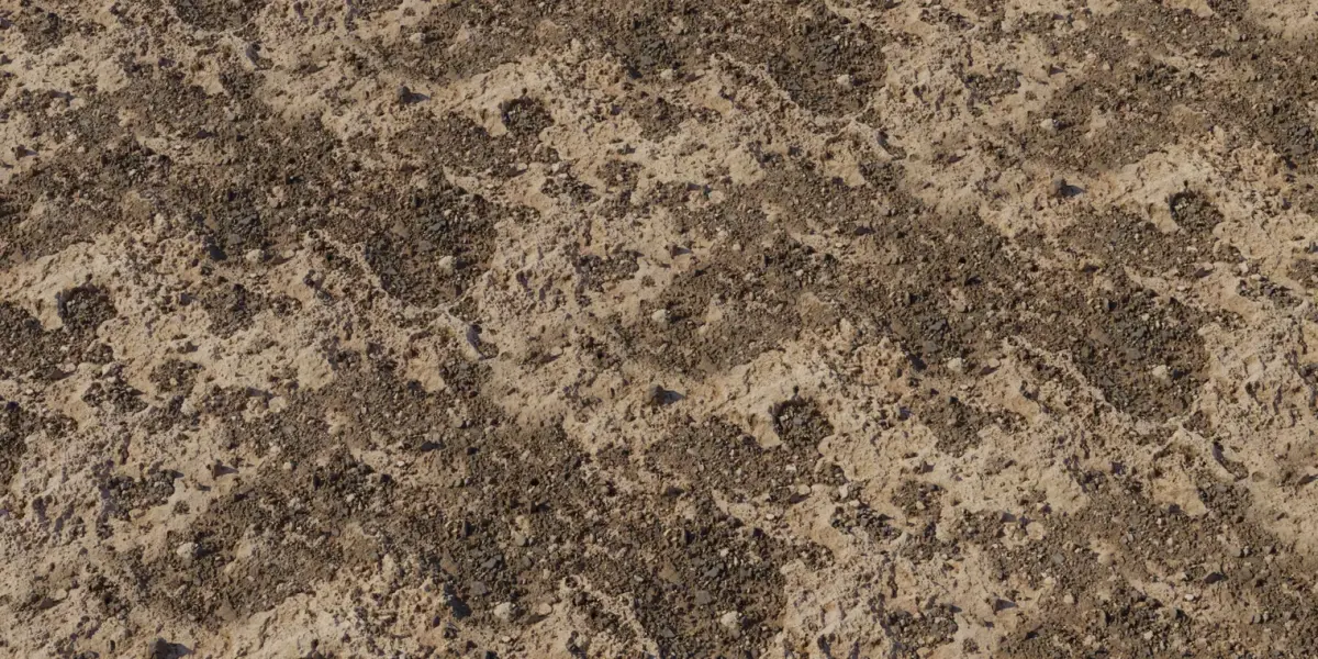 A tileable ground material featuring sun‑baked pale mud interlaced with darker pebble‑rich patches, ideal for dried riverbeds, construction sites, and arid terrain needing natural breakup. Scan‑based fidelity preserves crumbly mud edges, embedded aggregates, and soft mounding to prevent pattern repetition while holding detail in close‑ups and wide shots. Delivered as calibrated 4K PBR maps—BaseColor, Normal (OpenGL), Roughness, Height/Displacement, and Ambient Occlusion—compatible with Blender, Unreal Engine, Unity HDRP/URP, Substance, V‑Ray, and Corona. Use the Height map for parallax or true displacement to emphasize pebble relief and dried ridges, and adjust Roughness to art‑direct from chalky matte to slightly dusty sheen under varying light. Perfect for wastelands, farm tracks, excavation yards, and open‑world biomes that benefit from a high‑contrast dry ground base.
