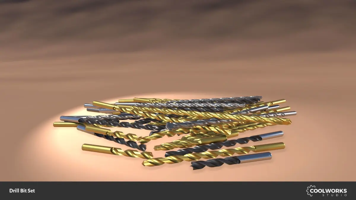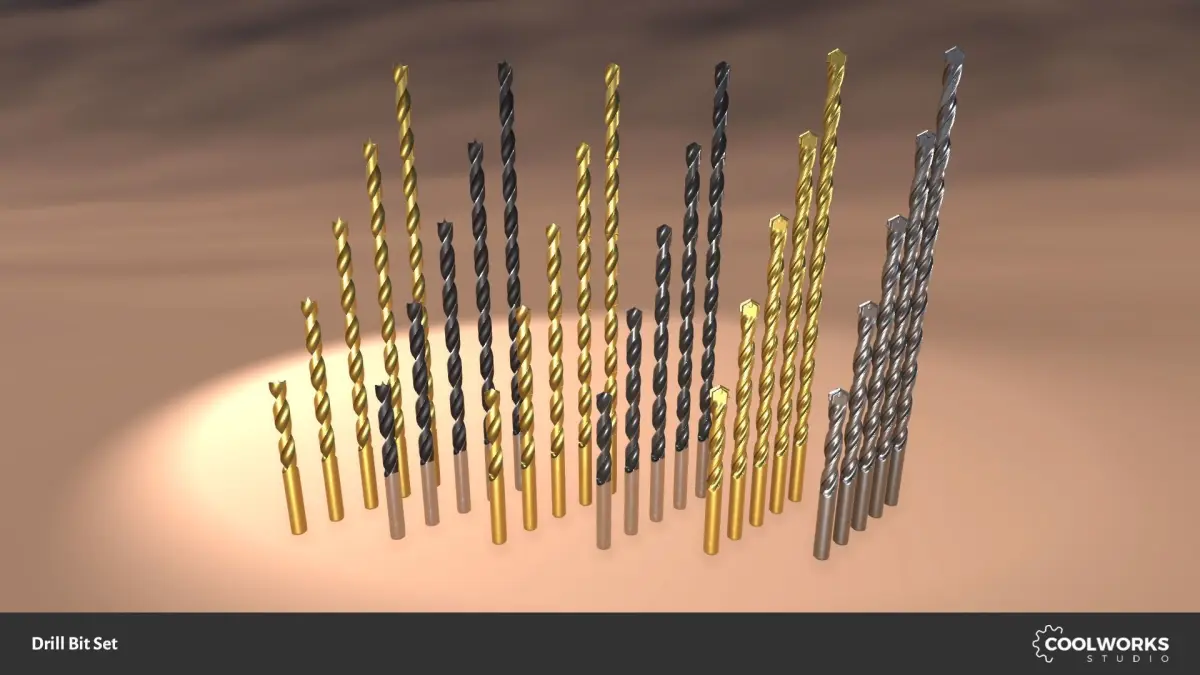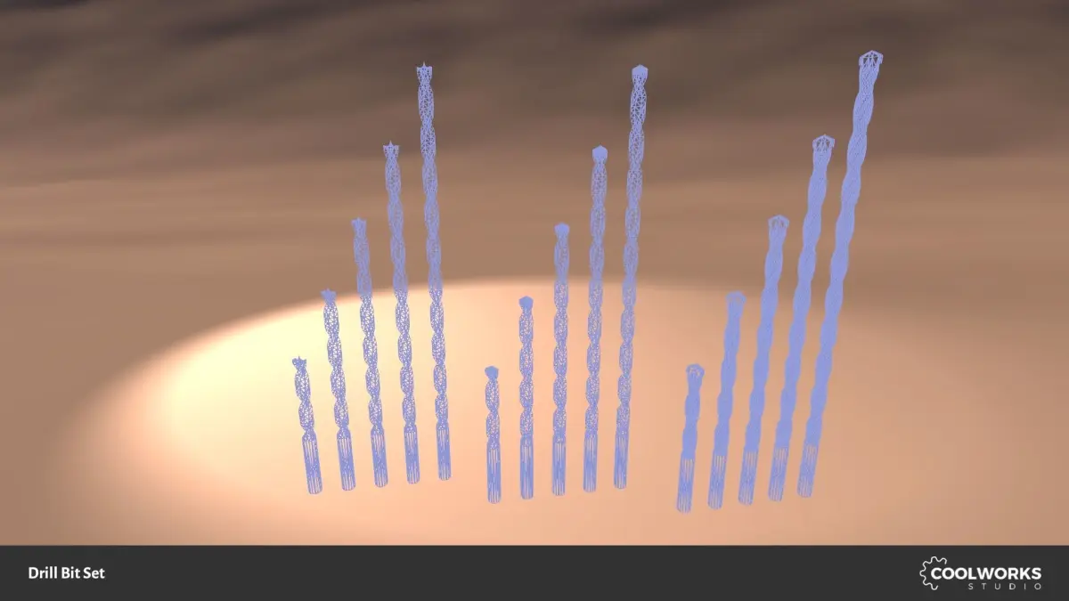 15 drill bit meshes (UV mapped) in five lengths in FBX format