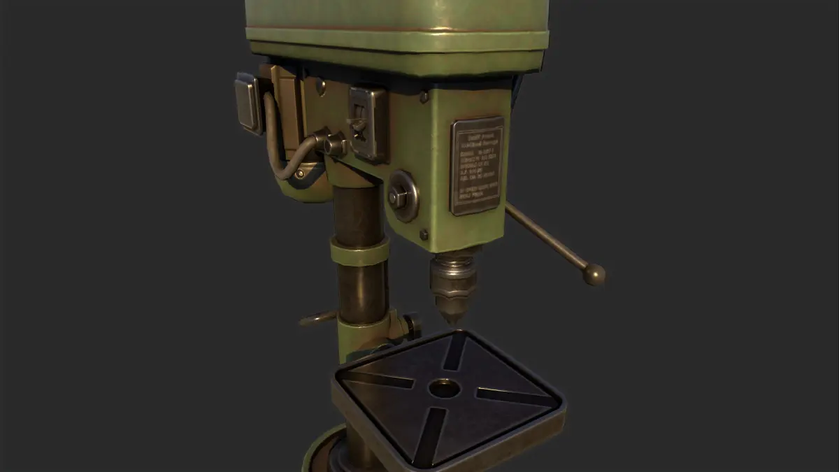 Highly detailed game-ready 3D model of a vintage bench drill press with clean topology and PBR textures, ideal for workshop or industrial environments.
