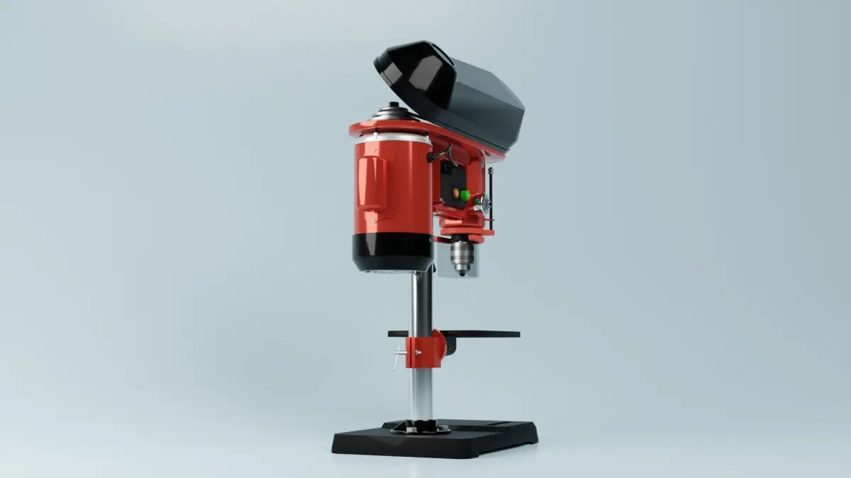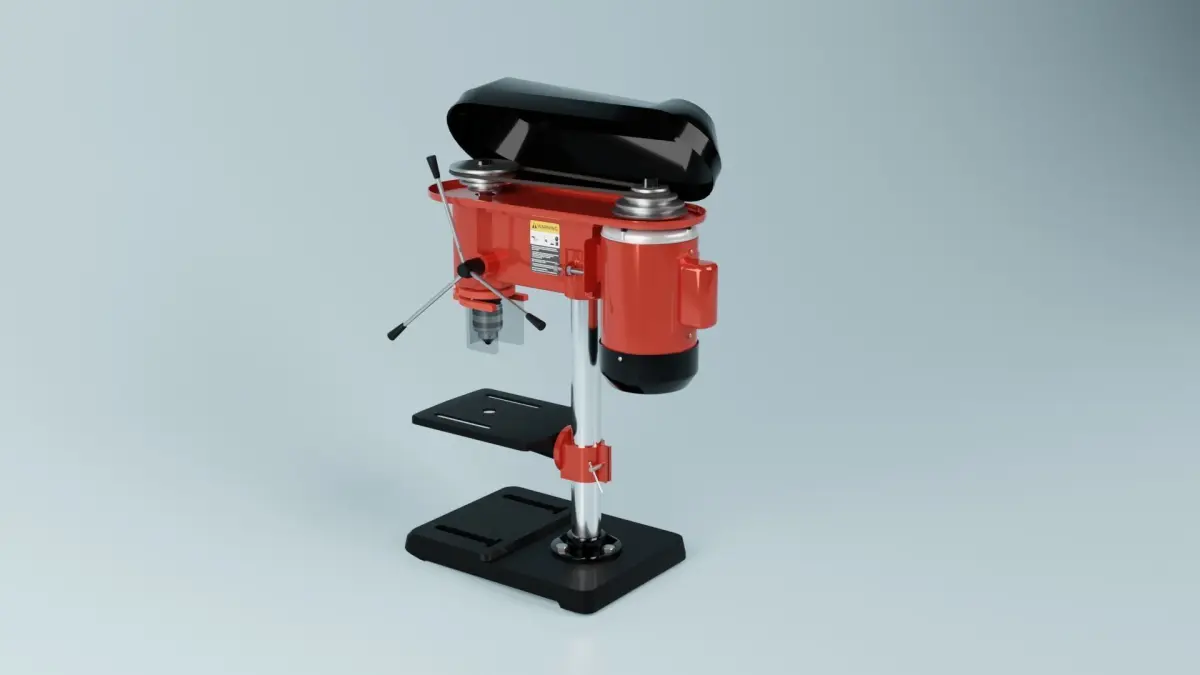3D model of a drilling machine. It includes all the components found in real equipment such as pulleys, belts, and control mechanisms. The cover of the pulley compartment is open. The model features control buttons and wiring for powering the electric motor. In the production of the model, the Add-on BoltFactory was used to create threaded elements. Import as planes add-on was used also. Textures were not used in the development of the model.