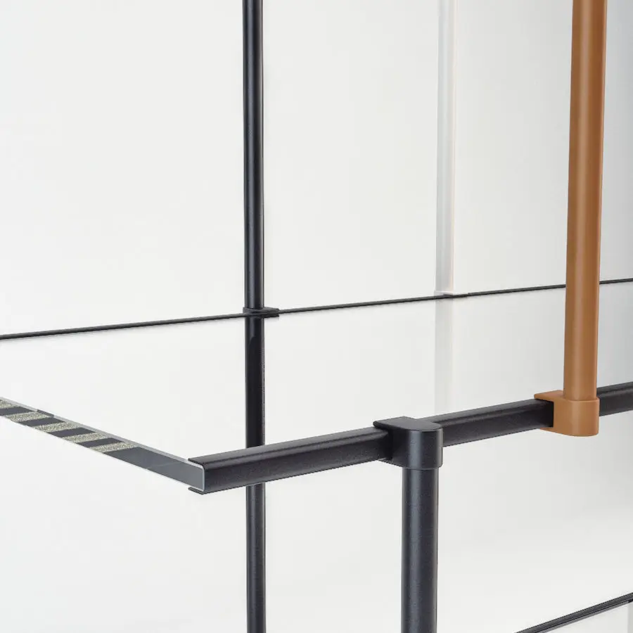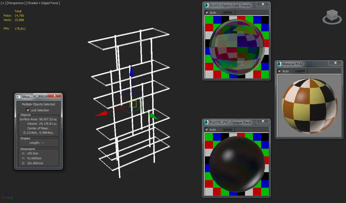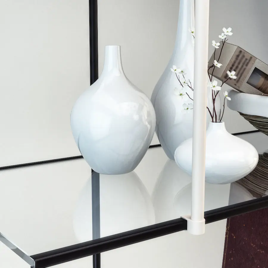 The shelving system model is presented as a group of meshes, consisting of: glass shelves, glass trim, support elements and the support rods.