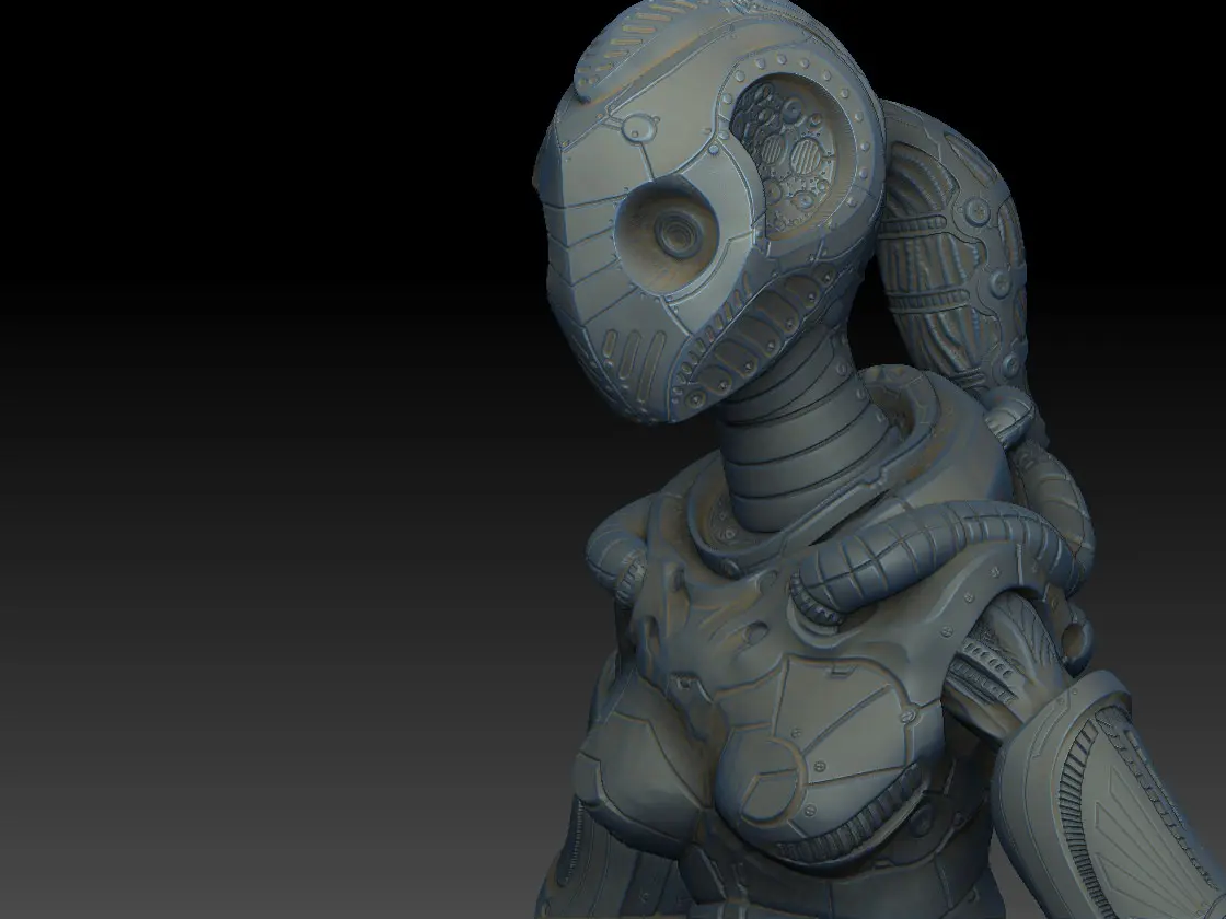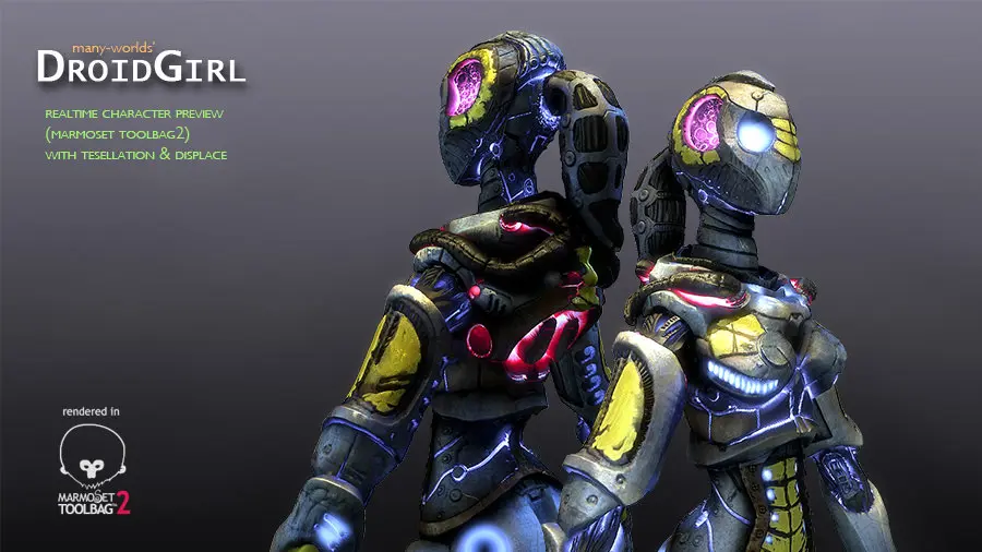 Droid Girl: Character fully rigged with 19 animations in a lowpoly skinned mesh with a very low polycount (2.2k triangles). Includes 36 different textures: 20 different color versions, 8 different emissive, displacement map (for tesellation purposes), normal map, oclusssion, 3 specular maps, and cavity.