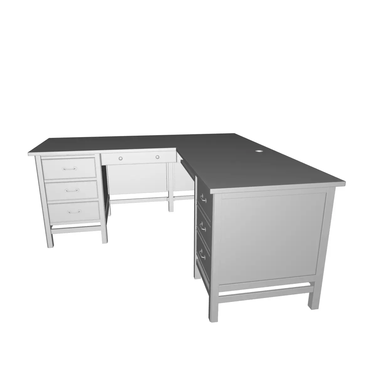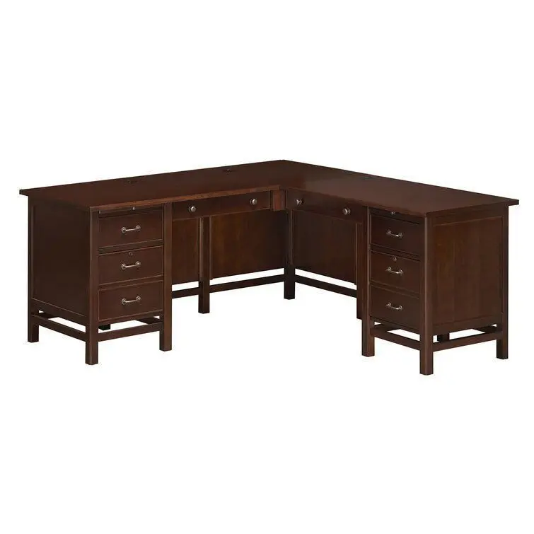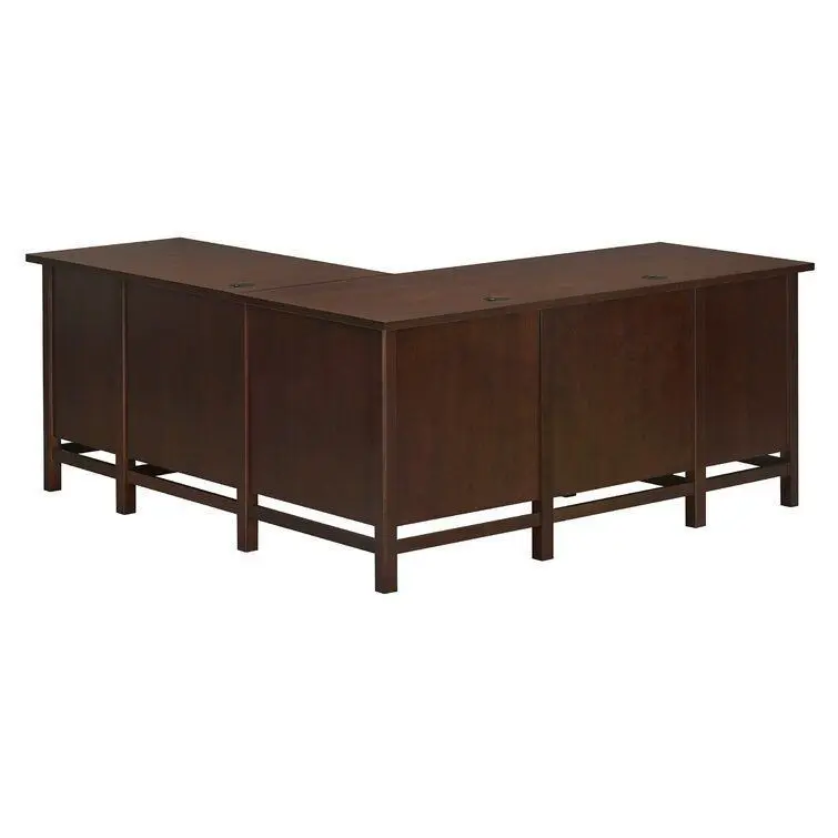 - This L-shaped computer desk features a corner design that allows you to spread out without taking up too much floor space. It's made from solid and engineered wood with a rich brown finish for a traditional look.