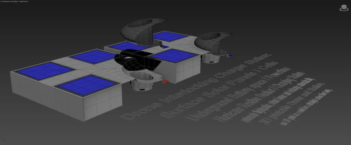 Below the blue solar panels is of course plenty of room for mounting battery packs, that can maintain full power or a better amount like 80% to maintain battery-life longer. the base could be equipped with an extra power and or information line of course, allowing the batteries to be fully prepared to receive its drone.