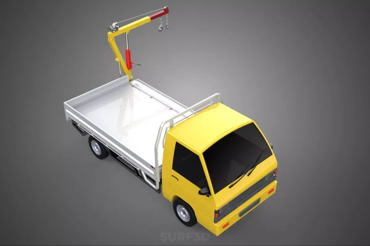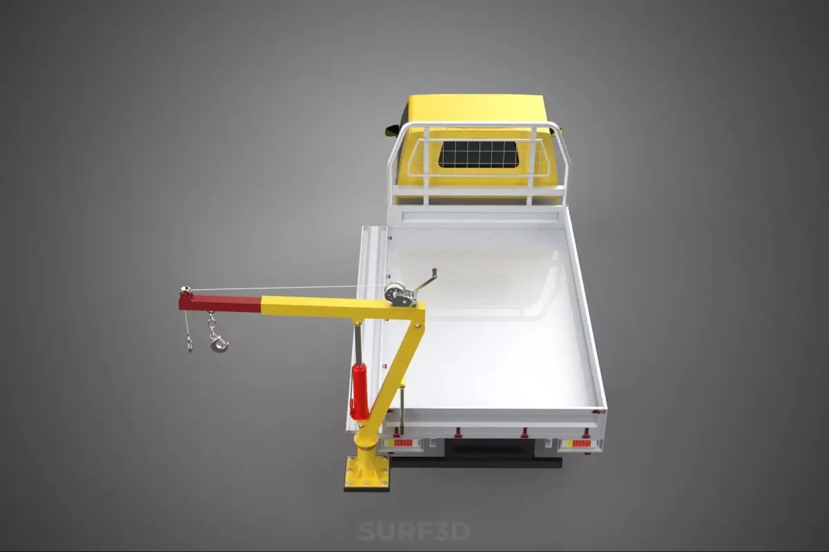 The DROP GATE BED component refers to the cargo area's design. The drop gate is the vehicle's tailgate, designed to fold down horizontally or be completely removed. This feature facilitates easier loading and unloading, provides an extended work surface, or allows for the transport of items longer than the bed itself. The term BED emphasizes the primary cargo area where materials are stored and transported. The SIDE DOOR aspect, in the context of a pickup bed, typically refers to enhanced accessibility from the sides, potentially through removable side rails, low-profile bed walls, or specialized utility body compartments that offer lateral access to tools and equipment. This ensures the jib crane can effectively position loads into and retrieve them from various points within the bed.