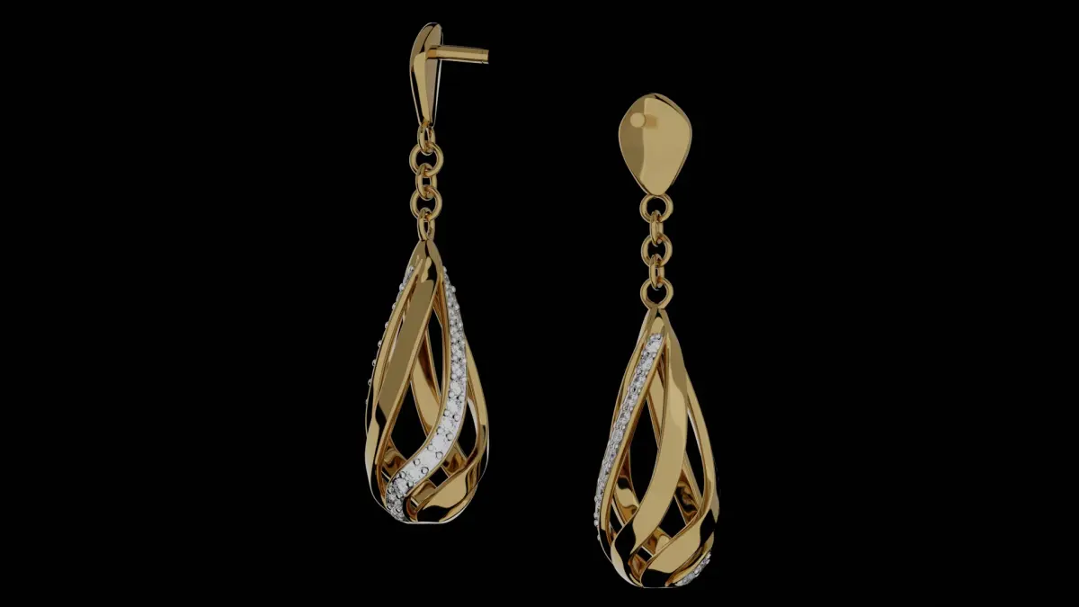 Earrings in the shape of a droplet with diamonds and a chain.