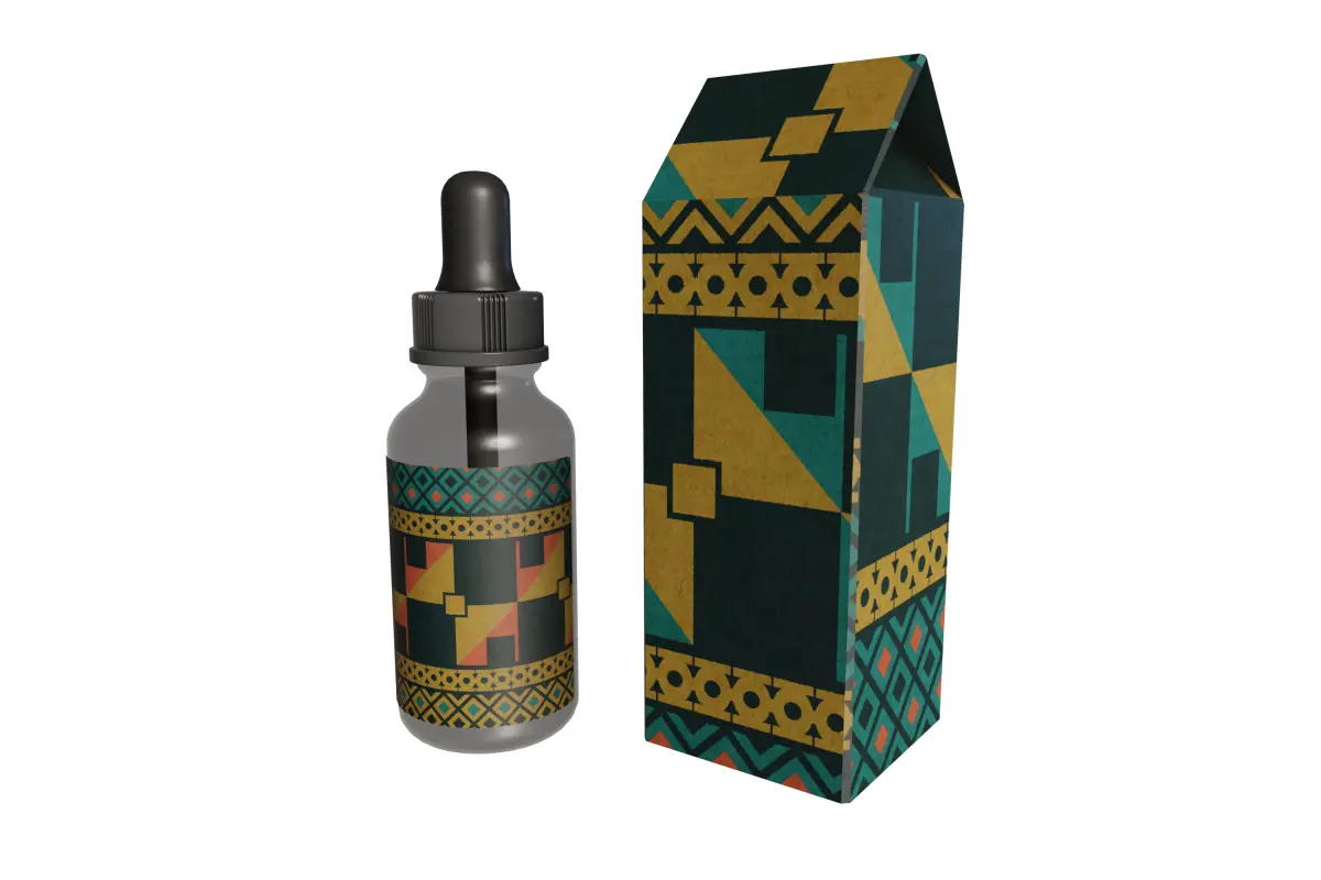 The dropper bottle is modeled with realistic details, including a transparent glass body (utilizing transparency maps for authentic light refraction), a distinct black dropper cap, and an attached label. The label seamlessly integrates the geometric pattern, offering a sleek and professional appearance.