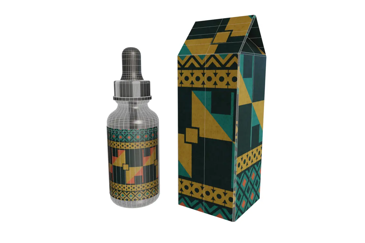 This is a high-quality PBR (Physically Based Rendering) 3D model set featuring a dropper bottle and its accompanying packaging box, designed for versatility and efficient rendering. Both assets share a cohesive and customizable graphic design with a modern geometric pattern, predominantly in shades of green, yellow, and black, making them ideal for product visualization in various industries such as cosmetics, pharmaceuticals, or essential oils.