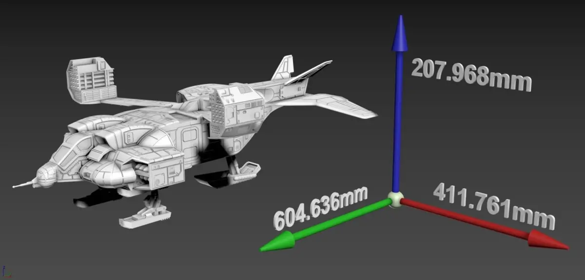 Dropship 32 mm scaleAsset Overall size:Height: 207mmLength: 604mmWidth: 411mm