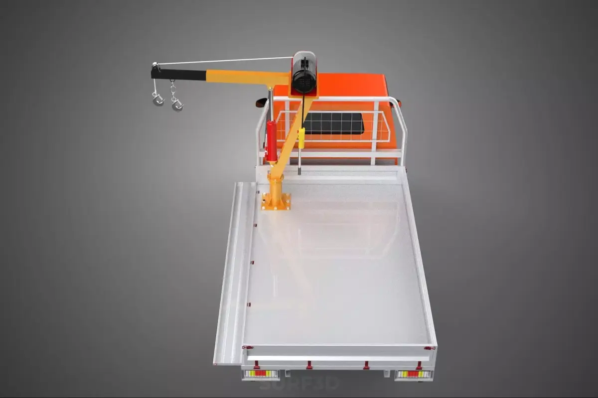 - Folding Jib Crane: The jib crane component is a pivotal structure mounted to the truck bed or chassis, consisting of a vertical mast or pedestal that supports a horizontal or articulated boom (jib). The folding characteristic is critical for vehicle-mounted applications, as it allows the jib arm to articulate, collapse, and stow into a compact configuration for safe and efficient transit. This prevents the crane from exceeding the vehicle's dimensions or height limits during travel. When deployed, the jib extends to provide a specific working radius and lifting height, often incorporating telescopic sections for variable reach. The crane typically features a rotation mechanism, allowing the jib to swivel on its pedestal, providing a working arc (e.g., 270 or 360 degrees, potentially limited by the truck cabin or other structures).