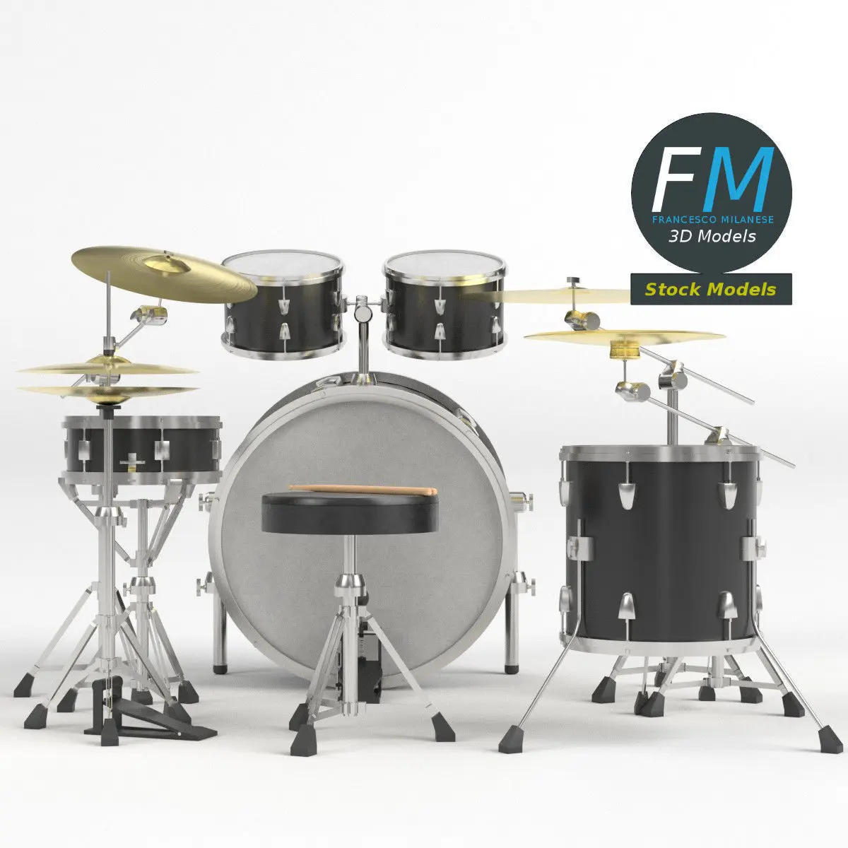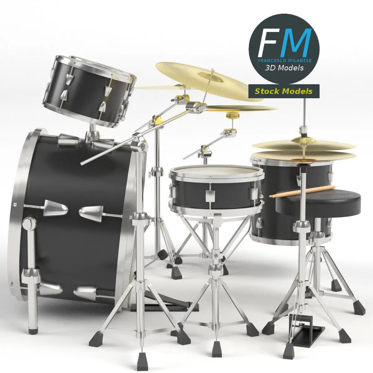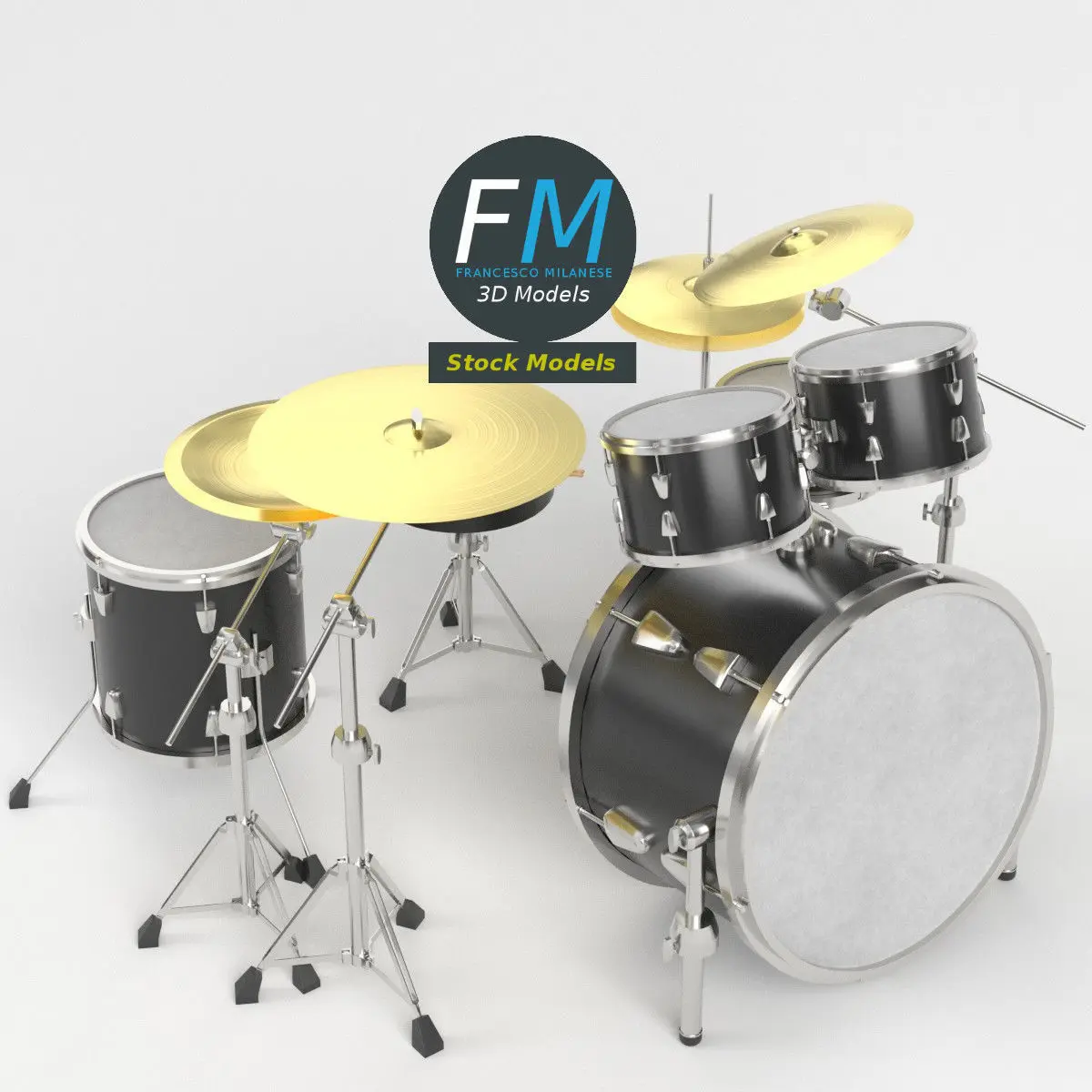 A drum kit 3D Model. 11 individual objects (2 sticks, throne, bass drum, tom-toms, snare drum, floor tom drum, ride cymbal, crash cymbal, hi-hat cymbal, China cymbal; so, you can easily move, rotate or even scale each item), sharing the same non overlapping UV Layout map, Material and PBR Textures set. Production-ready 3D Model, with PBR materials, textures, non overlapping UV Layout map provided in the package.Quads only geometries (no tris/ngons).Easily customizable: UV unwrapped geometries; UV Layout maps provided in the package as png with alpha images.Each Object, Material or Texture provided in the package has a unique, meaningful name.Made in Blender 3.3 with Cycles Principled BSDF PBR shader with textures included (Eevee compatible), then exported to OBJ and FBX (with embedded PBR Textures); materials and textures made in Substance Painter, exported for PBR, Cycles, V-Ray, Unity, Unreal.PROMO IMAGES: the first image has been rendered in Cycles for Blender; in particular, you can find 11+ promo images in this description: