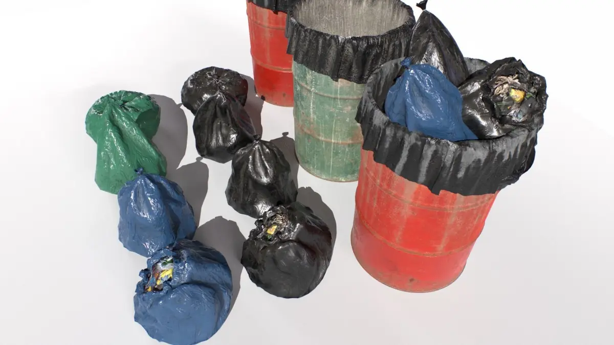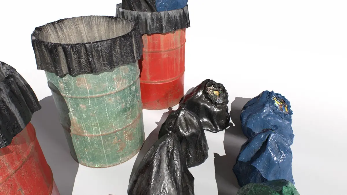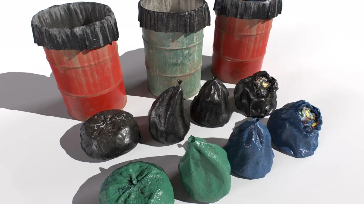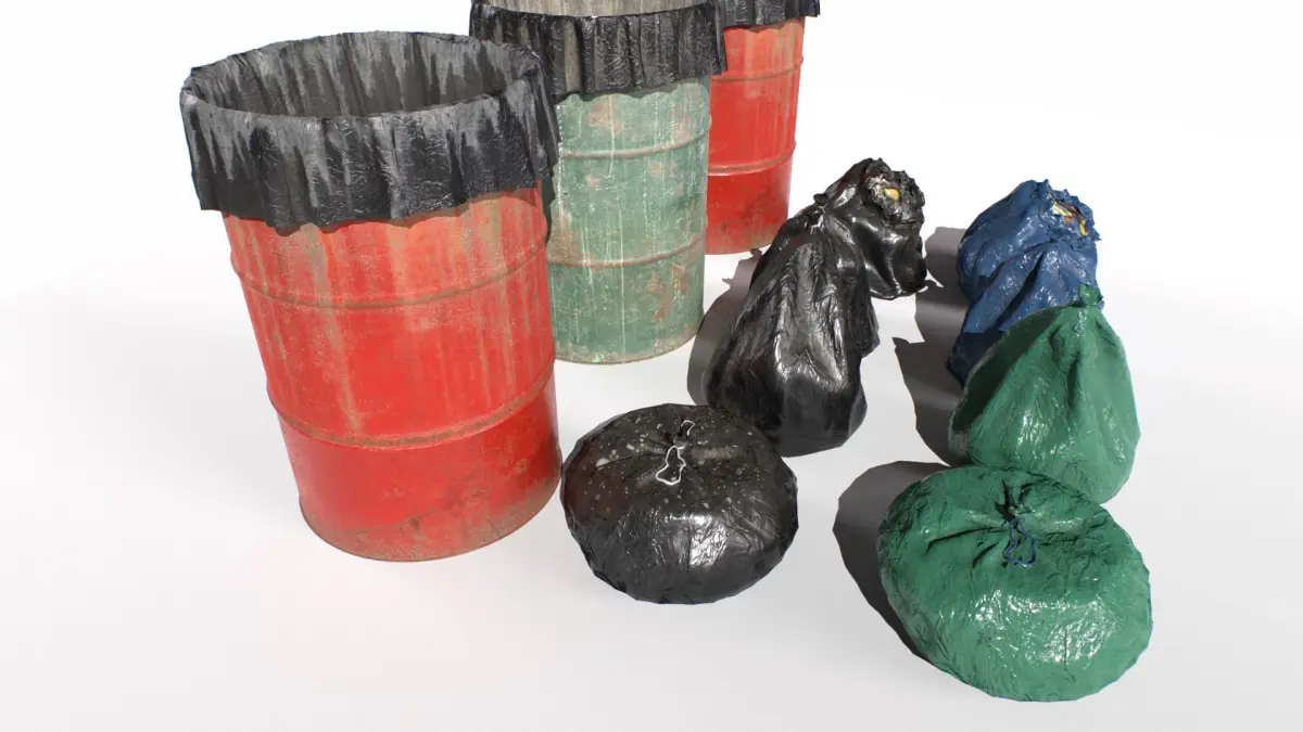 Pack of drum trash cans and bags . Realistic scale. Includes 4 bags and a configurable drum (barrel, trash inside and plastic bag are separate objects).