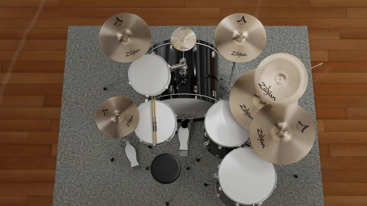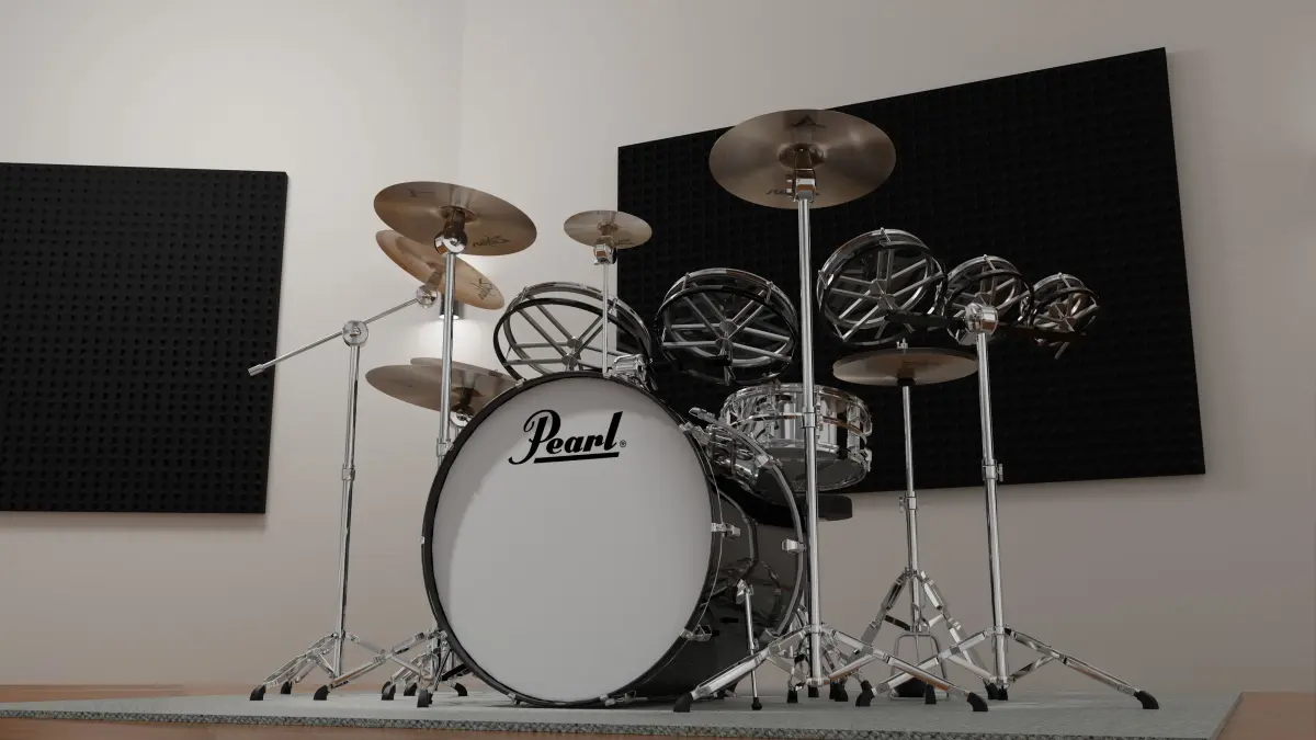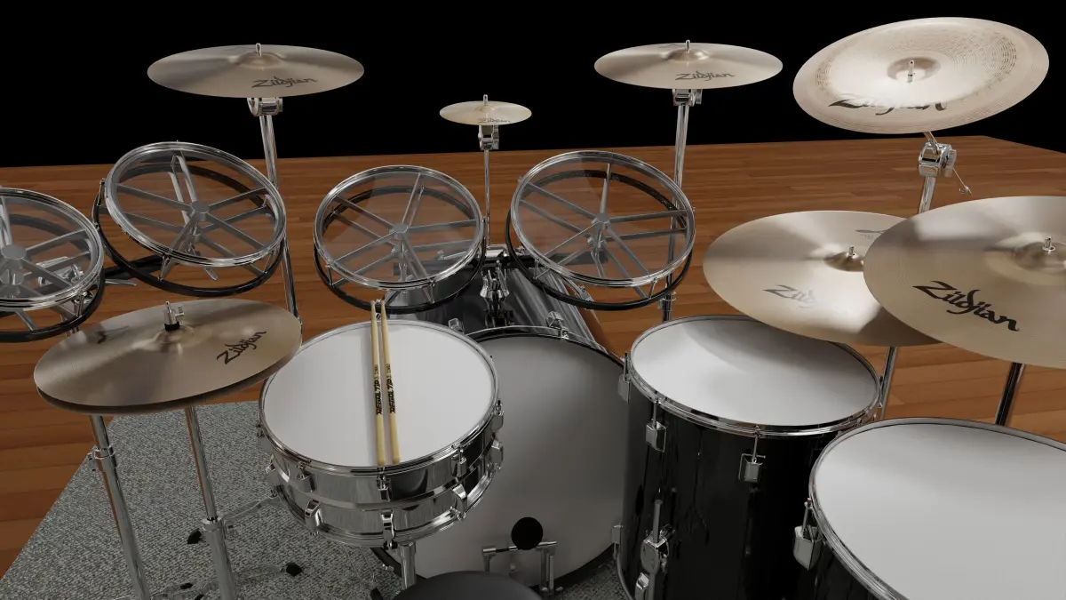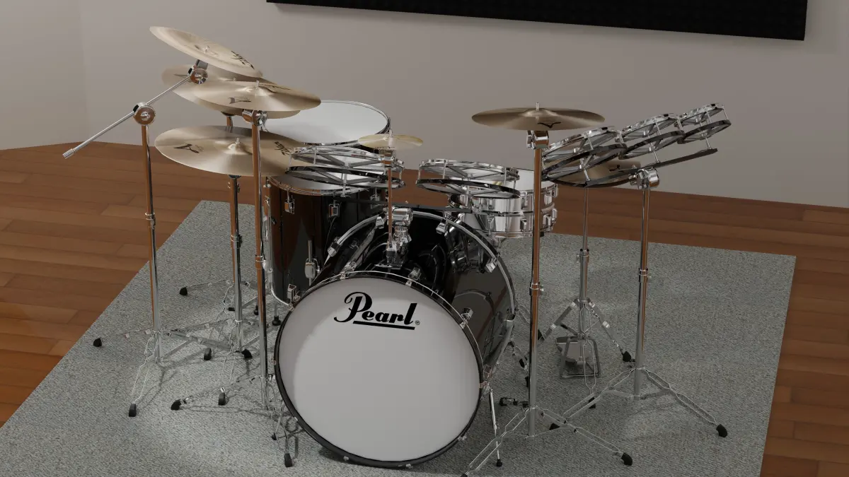 The studio stage is thrown in the Blender file, but not the exported OBJ and FBX. A few image textures are included for realism of the cymbals, Pearl logo, and wood finishes. Easy to import and drop into any scene for a high quality musical instrument render.