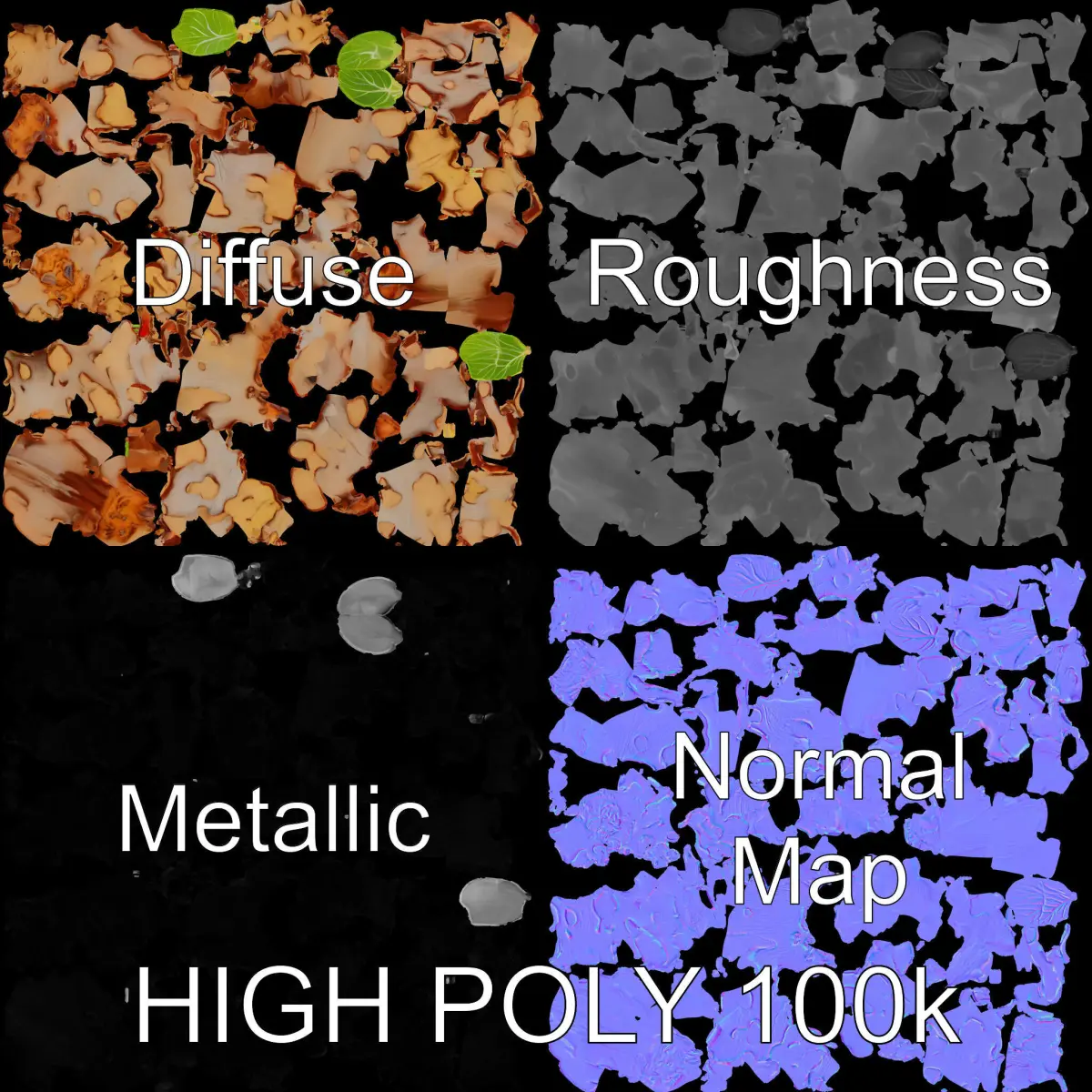 This 3D model pack features a dry tree branch with leaves, crafted in three levels of detail: low-poly, mid-poly, and high-poly, ensuring compatibility with mobile platforms, environment rendering, and high-quality production environments. With PBR, Diffuse, NormalMap, and reflection/roughness/metallic textures, all models are ready for immediate use in any modern rendering engine. The UVs are carefully unwrapped with no overlaps, enhanced by 4096*4096 resolution textures, offering crisp details for close-up renders.