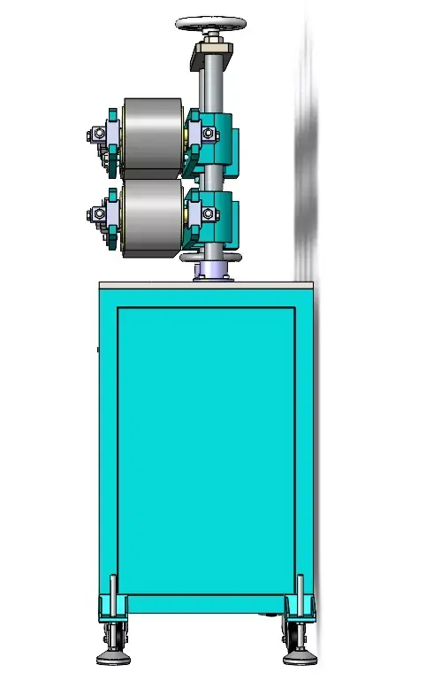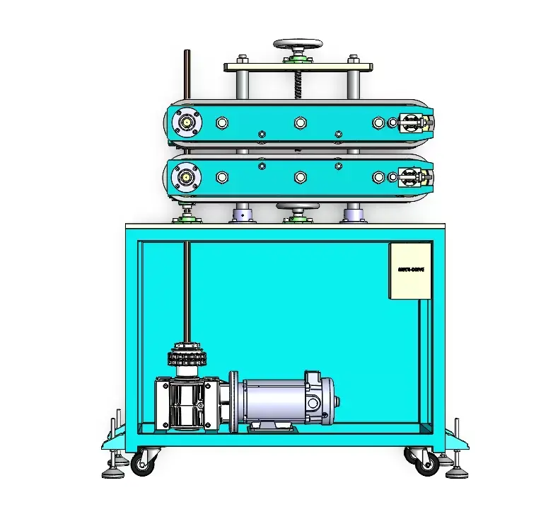 This is a dual-belt traction machine, a core auxiliary equipment for cable, pipe and profile extrusion production lines. It provides stable and continuous traction force for extruded products such as wires, pipes and profiles, realizing uniform traction and constant-speed conveying, ensuring the dimensional accuracy and production continuity of extruded products, and is widely used in plastic extrusion, wire and cable, pipe processing and other industries.The machine is equipped with two sets of symmetrically arranged annular traction belts, which provide uniform and non-damaging traction force through large-area contact with the workpiece. It is driven by a motor and reducer, with a manual handwheel adjustment device driven by trapezoidal lead screws to adjust the distance between the upper and lower belts. This structure features labor-saving operation, precise positioning and strong self-locking performance, flexibly adapting to the traction requirements of workpieces of different specifications. The integrated cabinet frame with universal wheels and adjustable support feet ensures convenient movement, stable operation and easy maintenance.