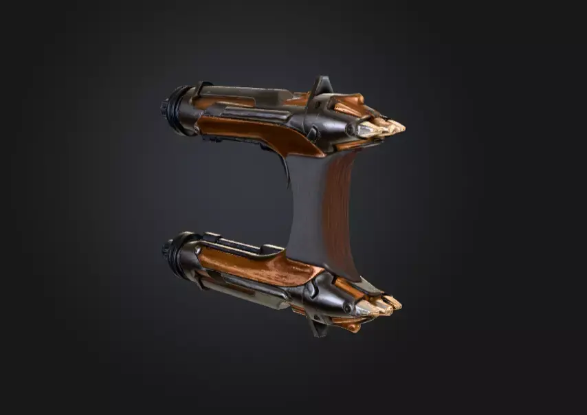 The central grip, carved from deep-grain walnut, feels organic and refined, seamlessly flowing into twin metallic structures that mirror each other in flawless harmony. Each barrel gleams with a tempered finish of dark steel and copper undertones, suggesting both modern engineering and timeless craftsmanship. The smooth surfaces transition into intricate mechanical grooves, reflecting an understanding of both beauty and function — a weapon that feels as much a sculpture as it is an instrument of precision.