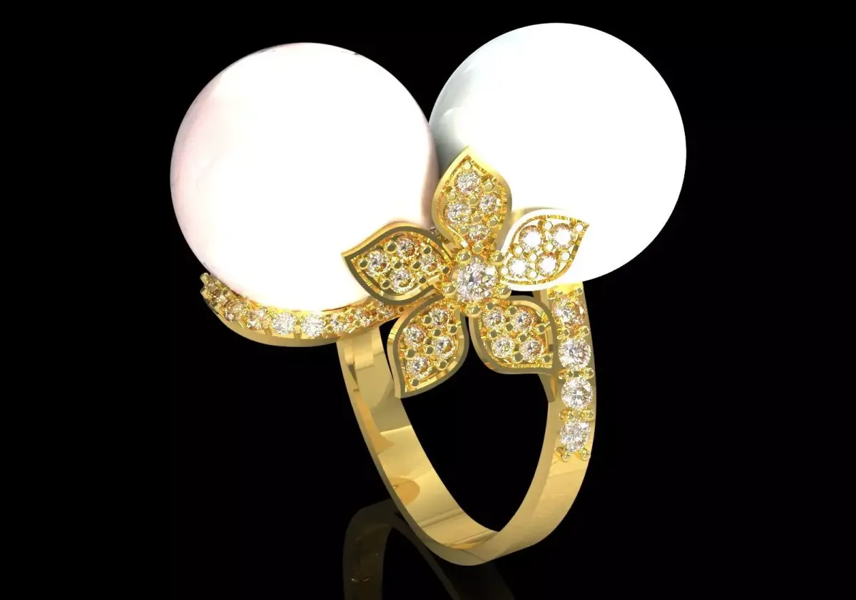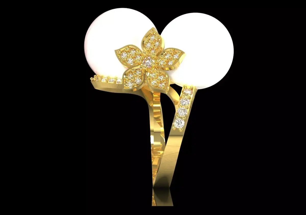 PR0073 Ring: Dual Pearl Paved Flower Ring, symbol of organic luxury, nature and extraordinary brilliance