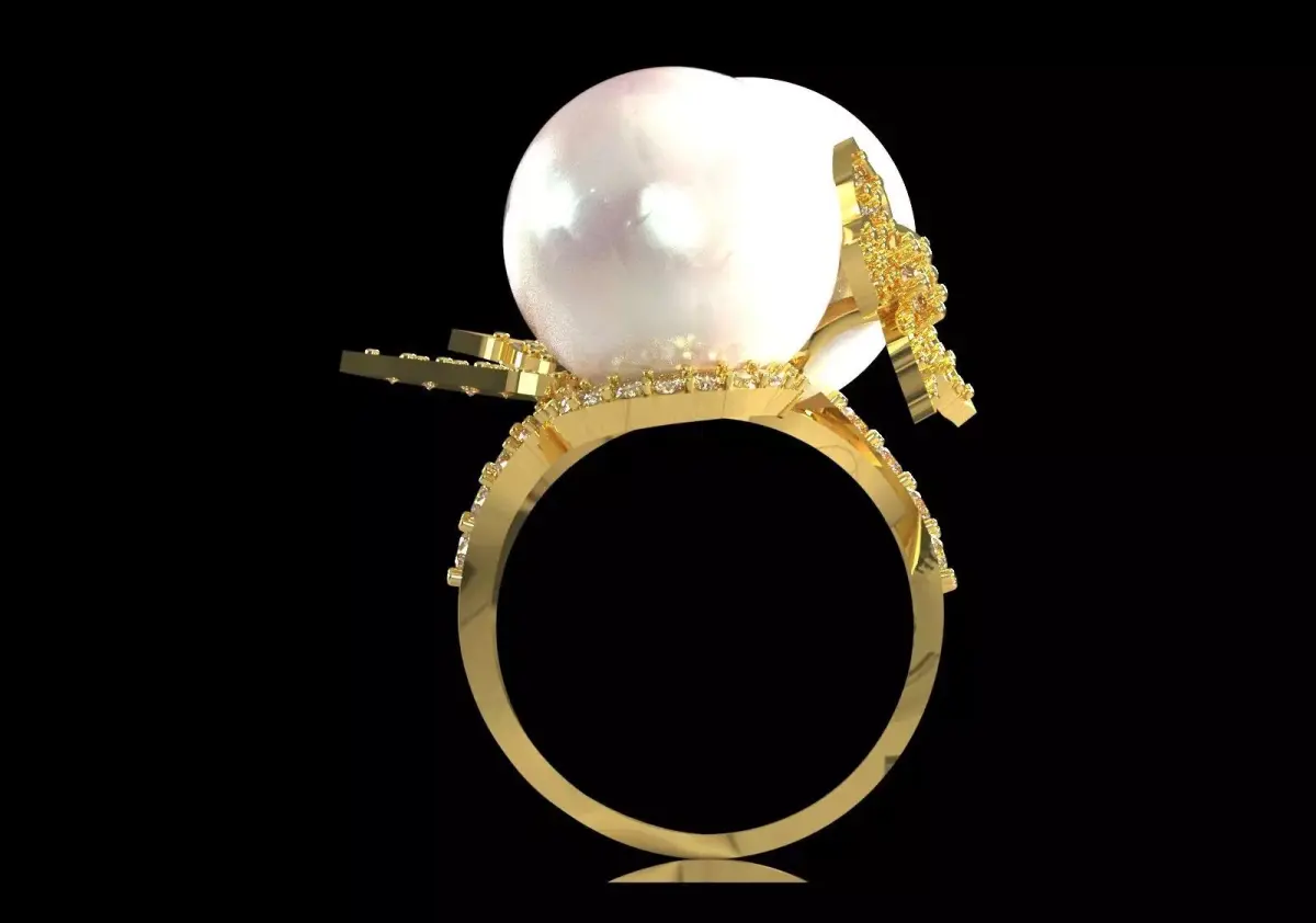 PR0073 ring is a Large Statement Cocktail Ring, highlighted by a diamond pave motif design surrounded by two large pearls. This piece focuses on volume, material combination (metal, diamond, pearl) and maximum shine, offering an ultra luxurious, feminine and artistic-natural look.
